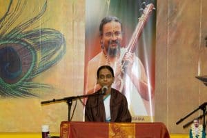 Day 1 began with a rendition of Madhura Gitam by young children of Dallas GOD. This was followed by the most awaited discourse(katha) by Sri Poornima ji – ‘Chala Pandarila Javu’!