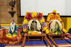 Day 3, being an Ekadesi day, Thirumanjanam was performed to the divine couple and Sri Swamiji’s holy Padukas by Sri Poornima ji. Following this, Govindapattabhishekam was celebrated with Srimad Bhagavata parayanam. Variety of food was offered to the great bhagavata – ‘The Govardhana’ hill by the devotees in all joy. This form of Sri Krishna where He lifts the hill on His little finger, ‘Giridhari’ of Sant Meerabai was sweetly brought to everyone’s thoughts by Sri Poornima ji’s brief talk on the subject. Following this was Garuda Vahana procession and Thepotsavam celebrations with the divine couple. The final day of utsav concluded with Sri Poornima ji’s last day of katha in the ‘Chaala Pandarila Jaavu’ series. Around 200 to 250 people attended the Madhurotsav joyfully. Mahaprasad was served to all on all 3 days.