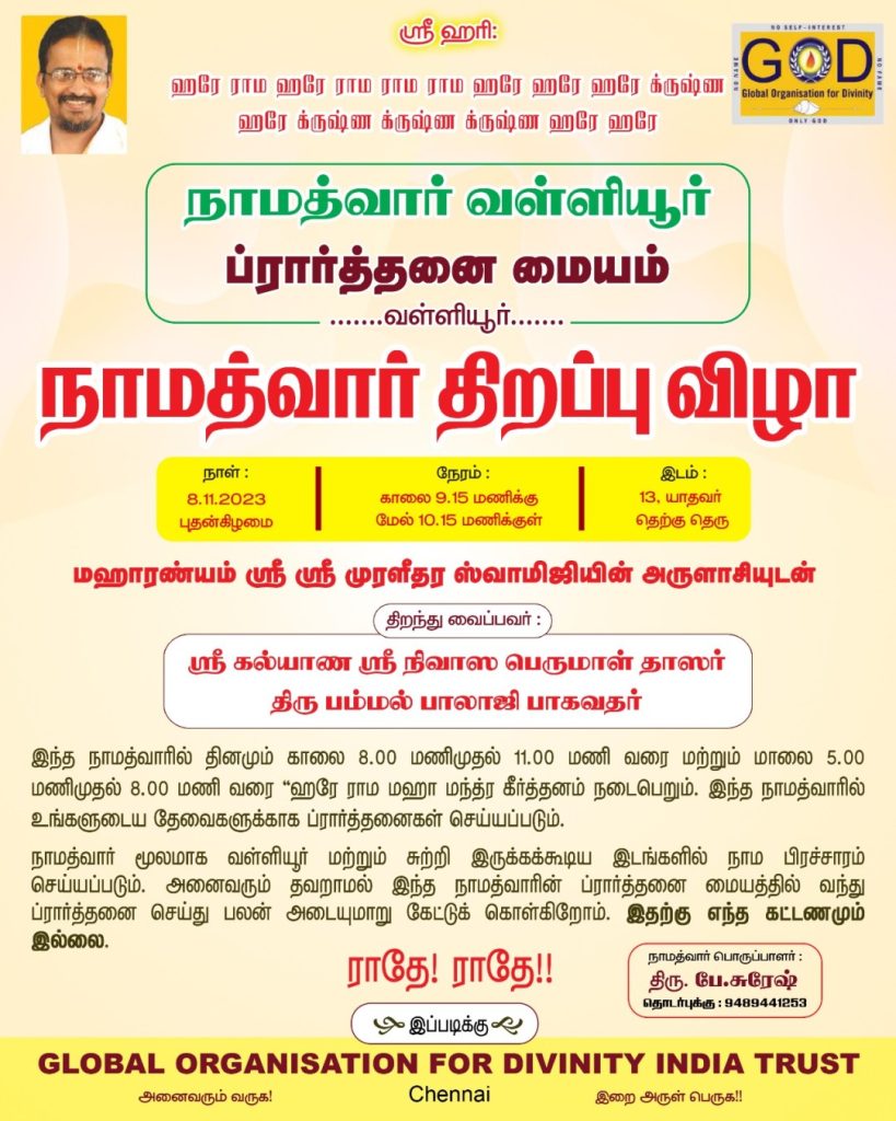 Radhe Radhe. Pranams and Humble Prostrations to Guruji Maharaj’s Lotus Feet. There’s not even an iota of incertitude that Valliyur is the next Spiritual Center, blossoming on Guruji MaharajJai Birthday, that’s going to Herald a new beginning and the lives of the devotees are going to be subsumed in Incalculable Bliss, Immense Prosperity and Unfathomable Happiness. Jai Guruji!