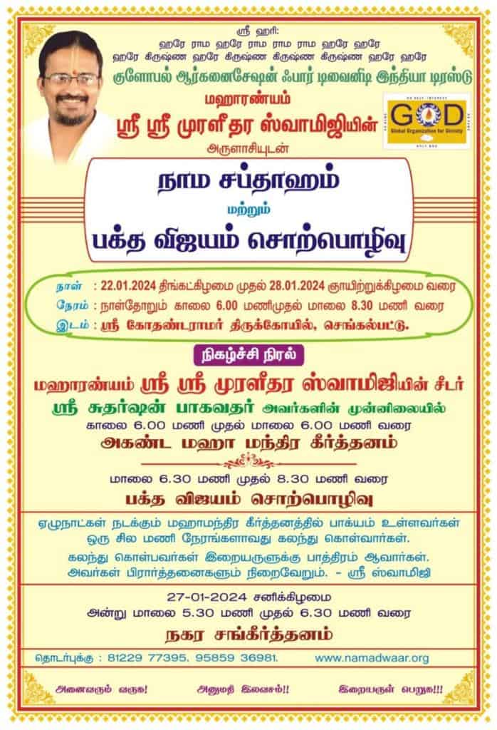 Radhe Radhe. Humble salutations to Guruji Maharaj’s Lotus Feet. Satsang orchestrated by Guruji Maharaj through Sri Sudharshan Bhagavathar in the hallowed precincts of Chengalpet will shower Guruji Maharaj’s Mercy on all the devotees!