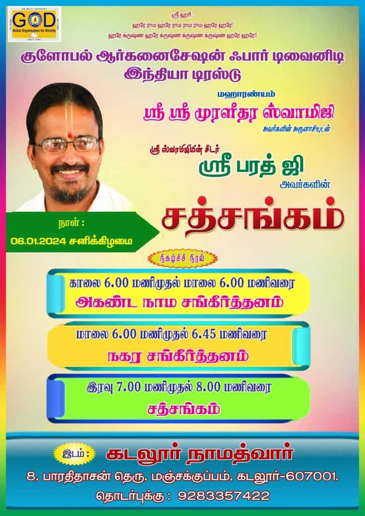 Radhe Radhe. Pranams and Prostrations to Guruji Maharaj’s Holy Feet. Cuddalore is an Infinitely Blessed place for it’s the Birth Place of our Venerable Guruji Maharaj. Satsang by Sri Bharathji adds Glory and Grandeur to this Divine location. The flavour and fragrance of Spirituality is going to encompass exponentially, thanks to the Satsang envisaged at this locality, under the Vibrant Guidance of Respected Guruji! Grateful…