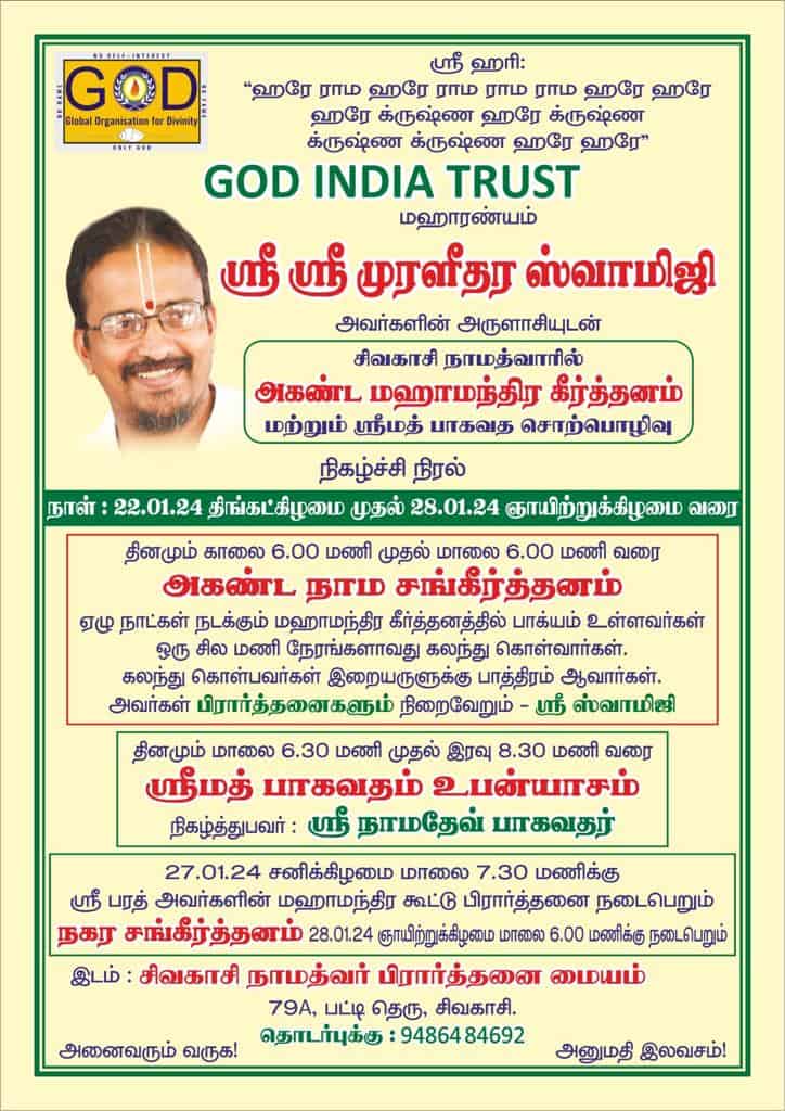 Radhe Radhe. Pranams and Prostrations to Guruji Maharaj’s Divine Feet. Mahamantra chanting is the Epicenter of our Spiritual Universe, revolving verily around our Venerable Guruji, Who’s beautifully evolving us from the mundane to the ‘excellent’ level. The metamorphosis of the inner self, catharsis happens, thanks to Guruji Maharaj. Sivakasi satsang will thus open the floodgates of Serenity! Grateful Guruji!