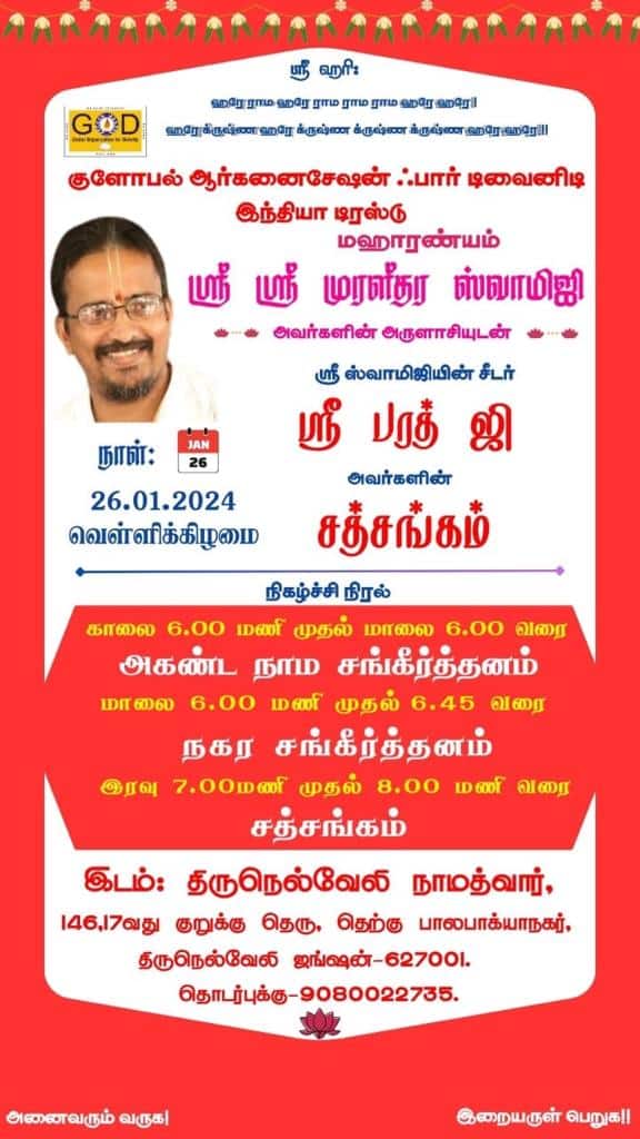 Radhe Radhe. Humble salutations to Guruji Maharaj’s Holy Feet. Satsang cruised by Guruji Maharaj have an exemplary aura. Satsang ensuing at Tirunelveli by Sri Bharatji, undoubtedly, will shower Infinite Blessings on Devotees!