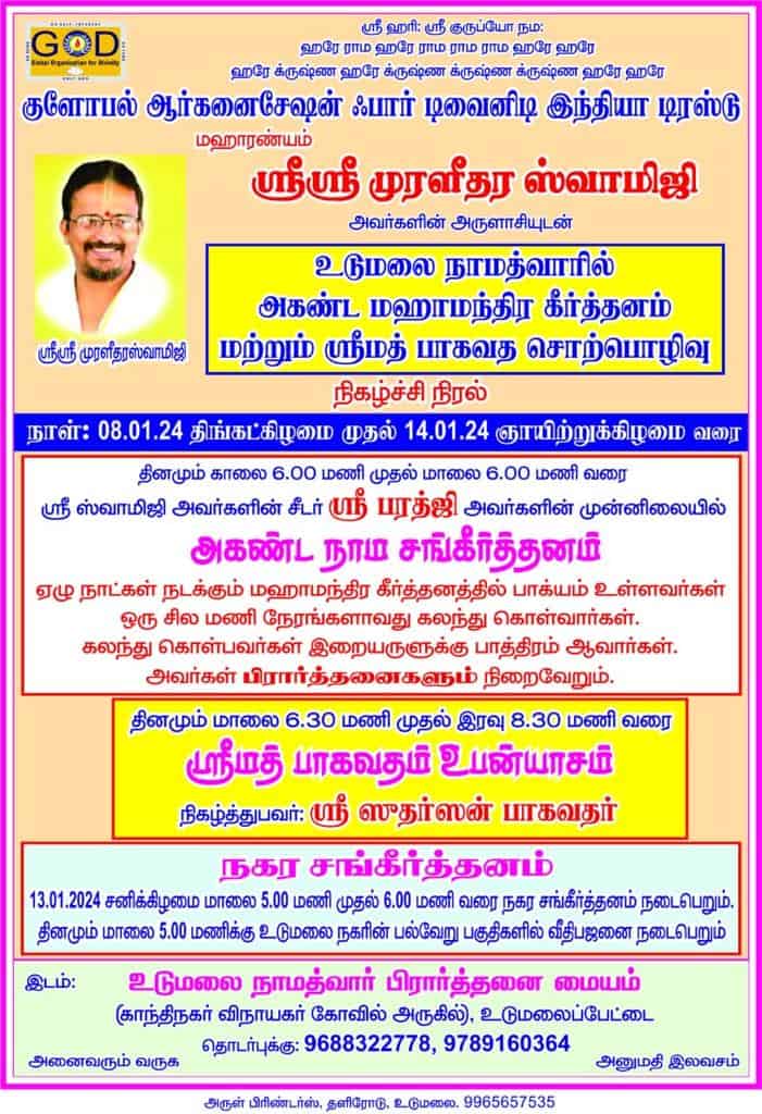 Radhe Radhe. Pranams and Prostrations to Guruji Maharaj’s Holy Feet. Udumalpet is making gigantic leaps in the propagation and dissemination of the Mahamantra, Hare Rama Hare Rama Rama Rama Hare Hare, Hare Krishna Hare Krishna Krishna Krishna Hare Hare! Lodging the Mahamantra in everyone’s hearts securely, is the abiding endeavour of our Respected Guruji and thus He cruises such Satsangs of Unfathomable Divinity, heralding a new dawn for one and all! Grateful Guruji…..