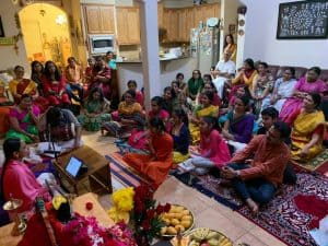 On the second day, the theme was “Sant padache jod dere Hari” or Sadhu Satsang Mahima. The Katha was held at the residence of Smt. Akila and Sri Chander ji. Speaking on Sant Tukaram’s charitram (as it was also around the time of Tukaram bheej or the day he went to Vaikunta), Sri Poornimaji emphasized on the greatness of Mahatmas, the value and importance of Satsang with sadhus, and how the most important prayer is for us to always have Satsang.