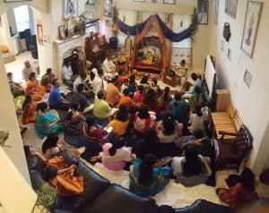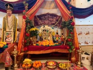 On the last day, after the Katha, devotees dressed up as Maharashtrian devotees and celebrated the Dindi Yatra to Pandharpur on the street while singing Vittala’s Names, just as devotees in Maharashtra do during ashada ekadasi. This was followed by an energetic Divya namasankirtan where men and women devotees took turns to dance around Lord Panduranga and Guru Maharaj, while abhangs and songs on Vittala were sung.