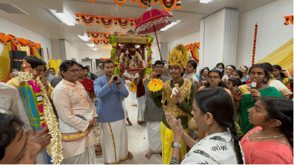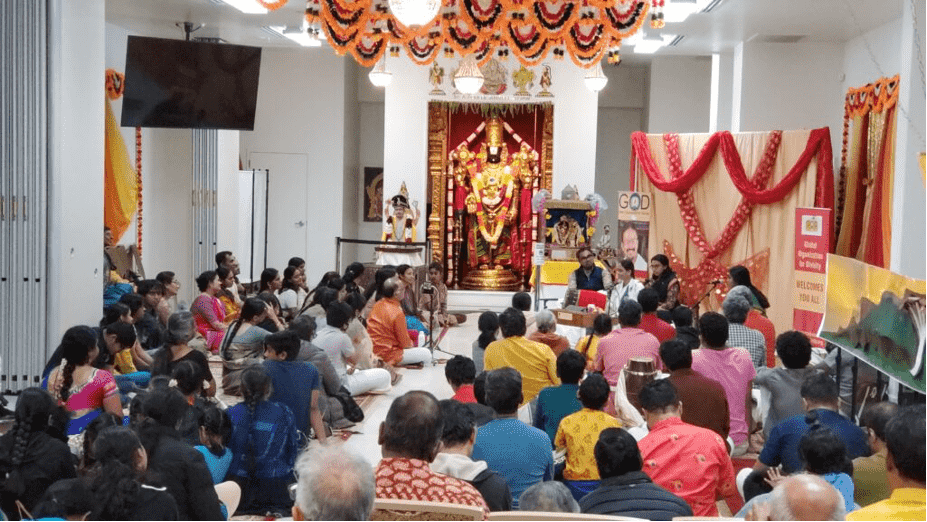 With the grace of HH Maharanyam Sri Sri Muralidhara Swamiji, and led by Sri Poornimaji, disciple of Sri Swamiji from India, there was not a dull moment in the 9 days of Utsav. The highlight was Sri Poornimaji’s unique katha on Sri Venkatesha Vaibhavam, where she spoke of the greatness of Sri Srinivasa Perumal (Lord Venkateshwara), the story of His descent on the Saptagiri hills, His wedding with Sri Padmavathi Thayar, and the stories of many of His great devotees including Thondaiman Chakravarthy, Sri Ramanujacharya, Ananthazhwar, Hathiram Baba, Vasudeva Thatha and others. Another unique event in the Utsav was that after each day’s katha, a special procession was conducted,and the story told in the discourse was depicted visually with props, dialogue and kirtan as part of the procession.This ‘anukaranam’ (divine enactment) was enjoyed immensely by devotees present there as well as devotees from around the world who watched the live Facebook broadcasts.