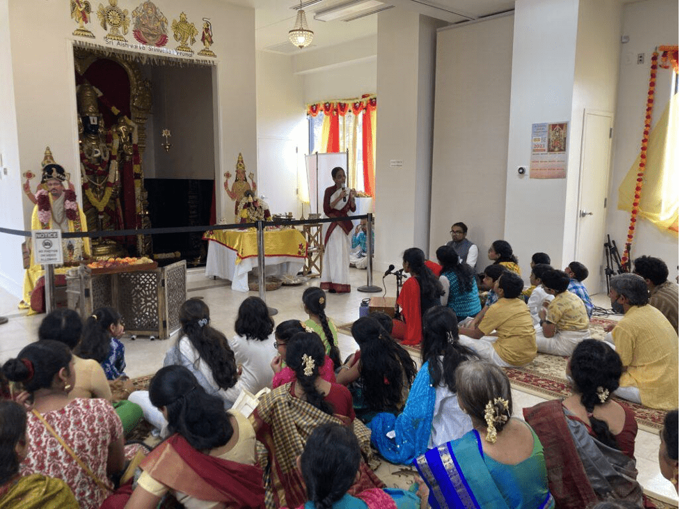 Other daily events included Srimad Bhagavata Saptaha parayanam, Tiruppavai recitation each morning followed by a brief Mahamantra ‘street’ kirtan, evening cultural programs and performances. A special ‘Nikunjotsavam’ concert was offered to Perumal by Sujanitha Umamaheshwaran, disciple of Vid Nithyashree Mahadevan, accompanied by Pranav Praveen on violin and Anirudha Narayanan on mridangam. Other cultural performers during the week included Pranav Sriram (devotional vocal), Harini Ganesh (Bharatanatyam), Sri Sisters (Madhurageetham vocal), Shreyasi Sundaram (Bharatanatyam), Preethi Ramakrishnan and Panchami Gopal (Bharatanatyam), Kimshukapriya Paunarkar (vocal abhangs), Priya Banga and Kavya Santosh (Hari katha), Prerana (Bharatanatyam), Maya and Kishore Iyer (violin duet) with Naga Srinidhi on mridangam. On one evening 32+ children and youth from all around USA and Houston rendered a Madhurageetham (composition of HH Sri Sri Muralidhara Swamiji) each as an offering to Perumal.