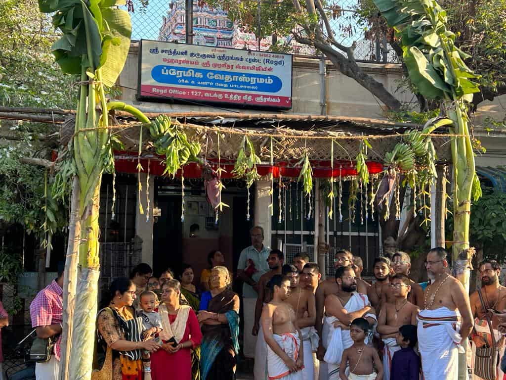 On 26th morning, Sri Swamiji visited our Sri Premika Vidhyasramam, Srirangam. Later, he inaugurated a new Patasala, “Sri Premika Upayuktha Veda Patasala” at Aadhikudi, near Lalgudi. Sri Ramesh and Sri Rhavi Shankher are ardent devotees of Sri Swamiji from Chennai. Aadhikudi is their ancestral village. They have constructed a new building there and have magnanimously dedicated it to the Patasala.