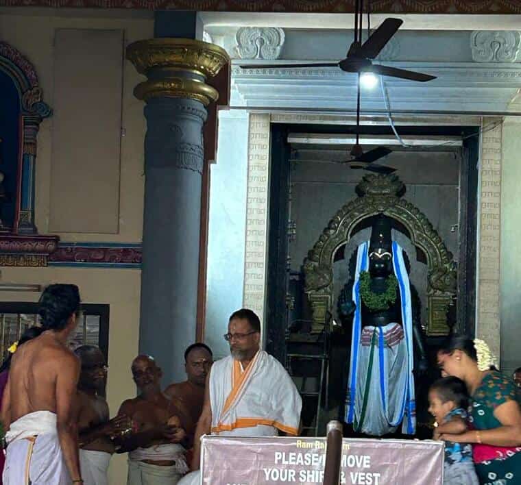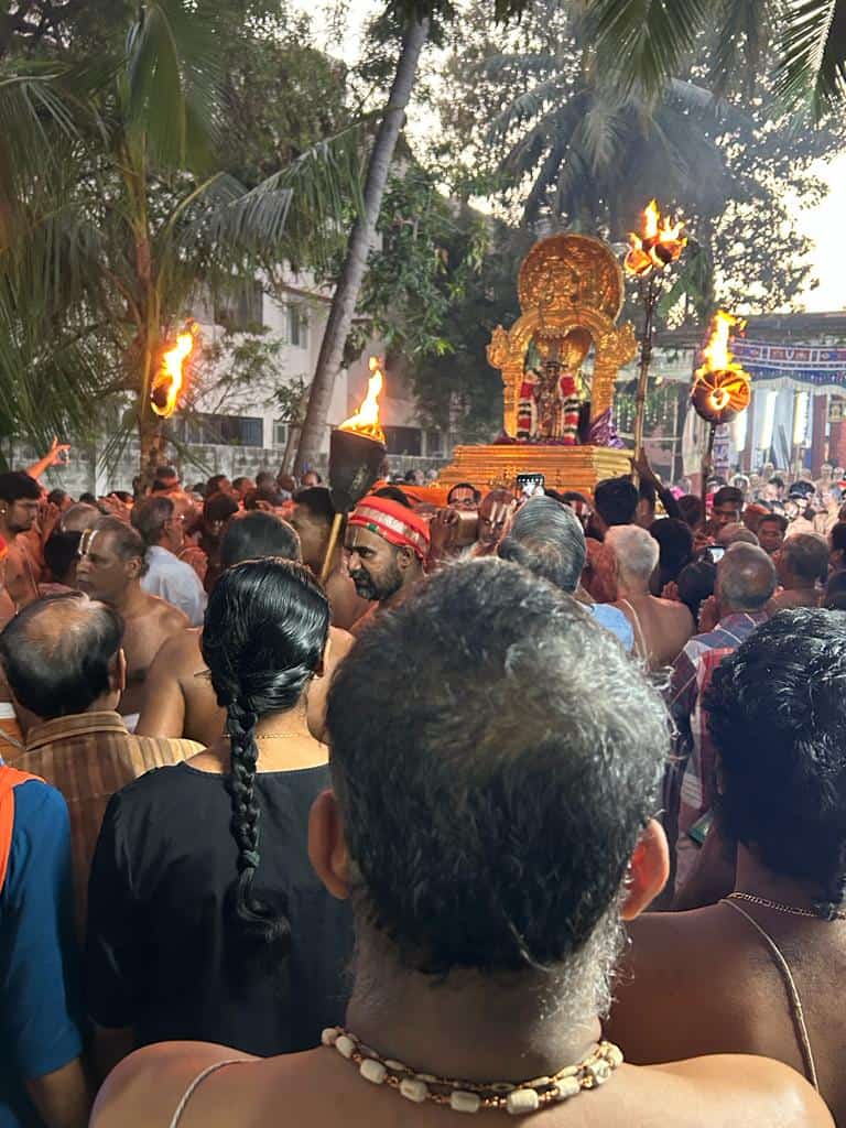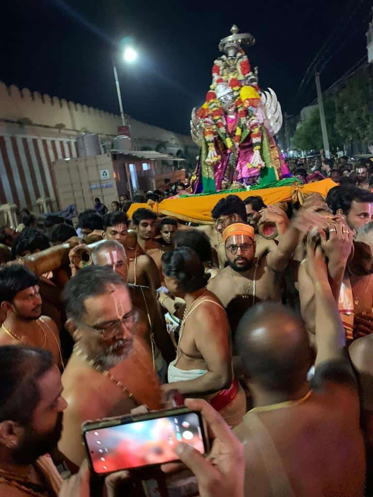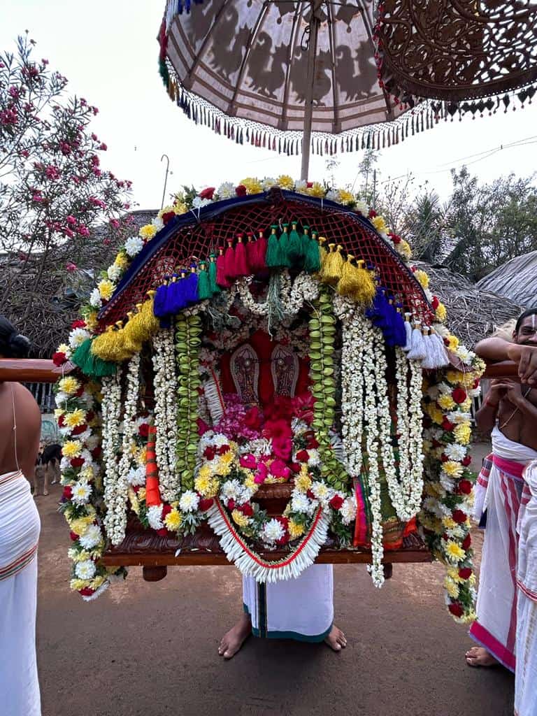 Later, he visited the residence of a devotee at Manakal, near Lalgudi. That evening, Sri Swamiji had the darshan of Sri Ranganathar in Garuda Vahanam when purapadu passed through the street where our Patasala is located. Many devotees of our Satsang together with Sri Swamiji waited eagerly to welcome Sri Namperumal in front of the Patasala joyfully chanting the Mahamantra. After that, he reached Govindapuram. On the 27th, he was in Govindapuram.