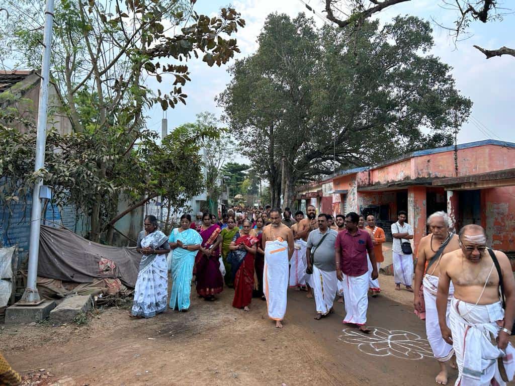 Sri Swamiji led Rohini Purapadu on February 28th at Senganoor. More than 50 devotees of Trichy Namadwaar are doing Akhanda Mahamantra Keerthan at Senganoor Namadwaar on 28th February. Sri Swamiji joined the Mahamantra Keerthan for some time. He distributed Theertha Prasad to all devotees. He had darshan of Sri Bhagavatha Anjaneyar at Govindapuram and left for Chennai.