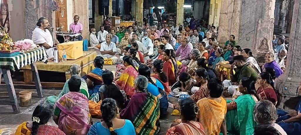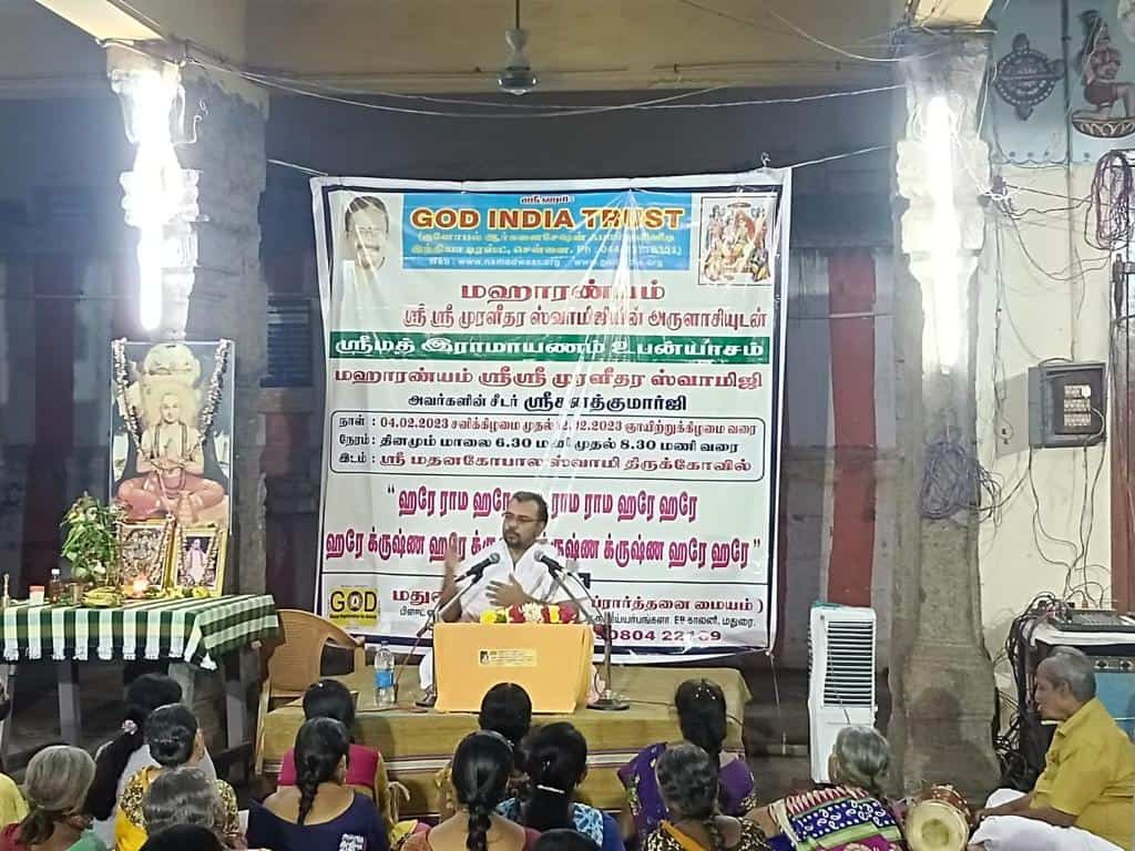 Sri Sanath delivered a lecture on Srimad Ramayanam at Sri Madhanagopala Swamy Temple, Madurai, between February 4 and 12, 2023. Over 100 devotees joined on all days.