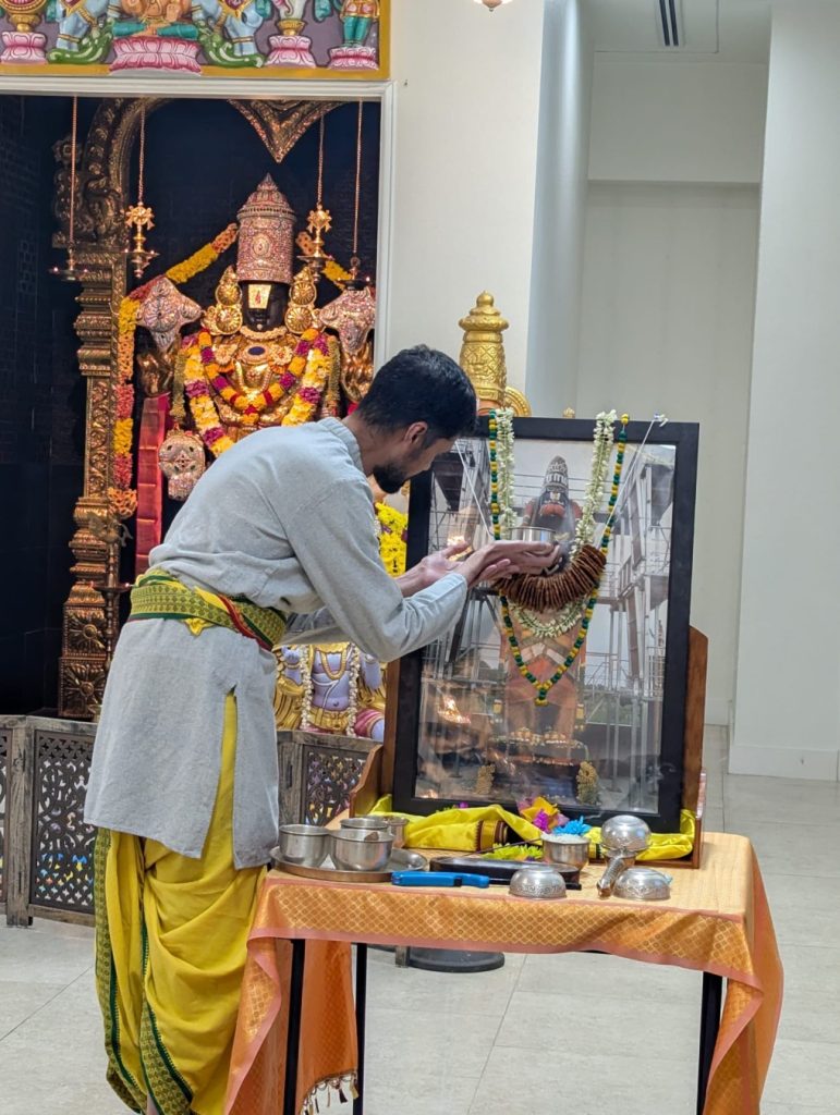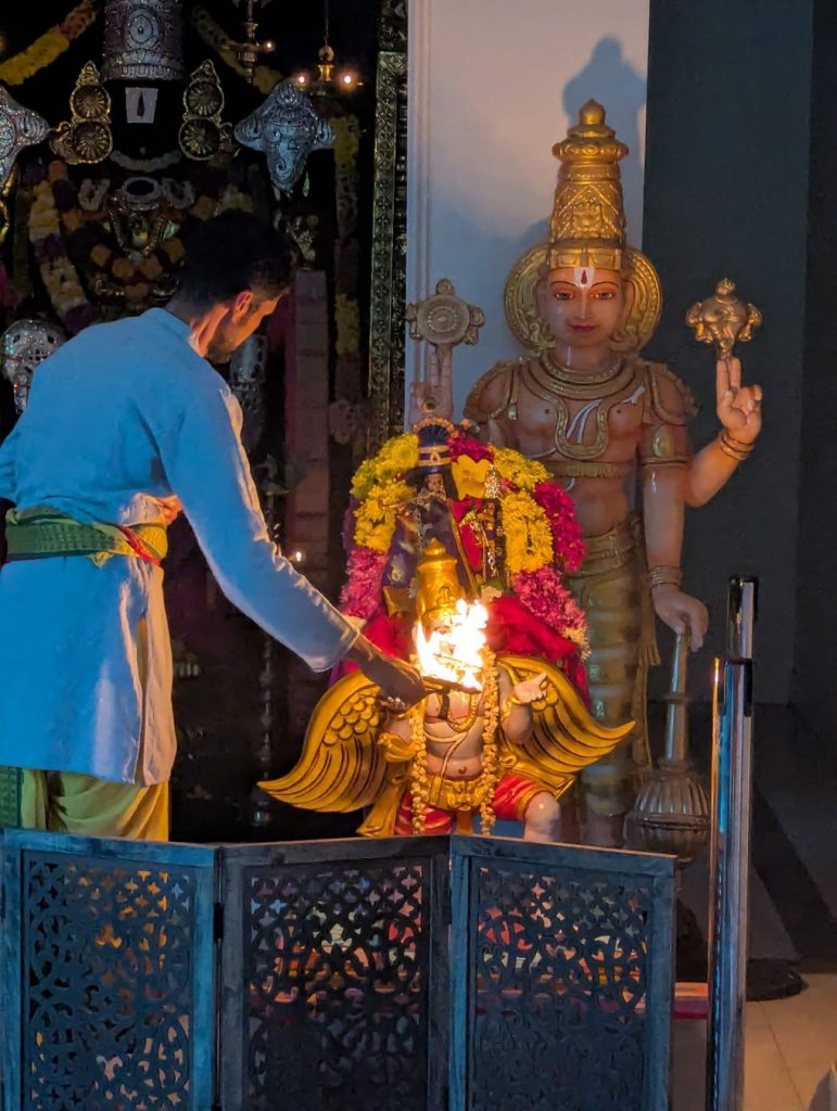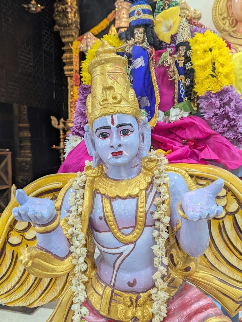 Sri Aishwarya Srinivasa Perumal temple was open all day to allow devotees to have darshan of Perumal and Madhuri Sakhi sameta Premika Varadan on Garuda vahanam. Coin prasadam was given to all devotees. The parayanam of Srimad Bhagavata Mahatmiyam was performed in the evening followed by Hanuman Puja and Maha Harathi.