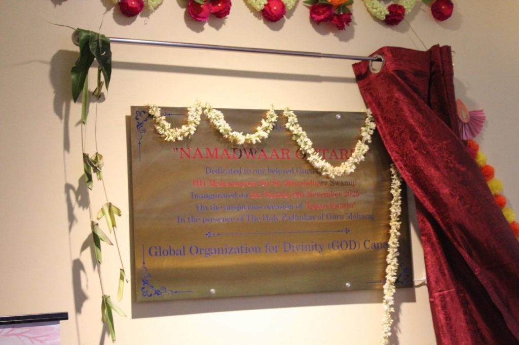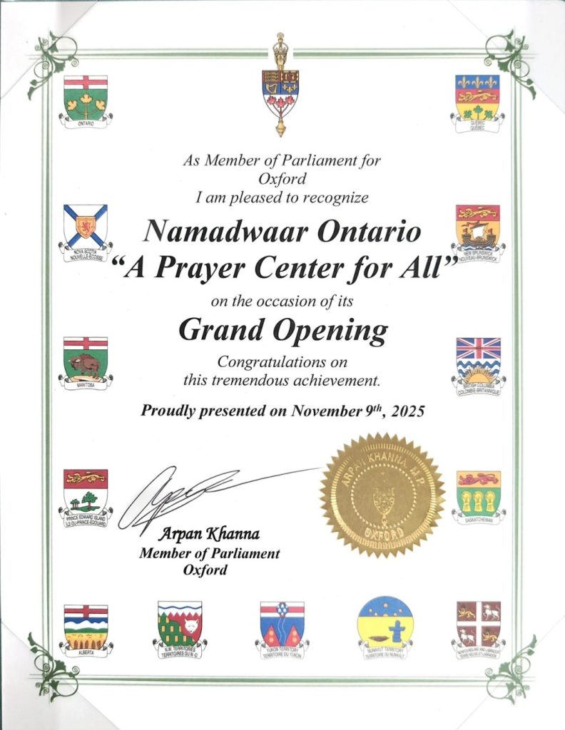 Festivities with Radha Kalyanam continued afterwards, and in the afternoon, a ribbon-cutting ceremony was held with special guests Canadian Member of Parliament- Oxford, Mr. Arpan Khanna, and the Mayor of Ingersoll. Mr. Brian Petrie. The officials were introduced to the activities of Global Organization for Divinity in Canada and worldwide, and also to Namadwaars worldwide. Both officials heartily welcomed Namadwaar Ontario to Canada and the Ingersoll/Toronto community. They also appreciated the uniqueness and message in GOD’s logo – No Name, No Fame, No Self-Interest. Only God. The MP also presented a ‘recognition plaque’ to GOD Canada. On this same day, in the Canadian House of Commons (lower house of parliament) in Ottawa, the capital of Canada, an announcement of the opening of the new Namadwaar prayer center in Ontario was displayed.