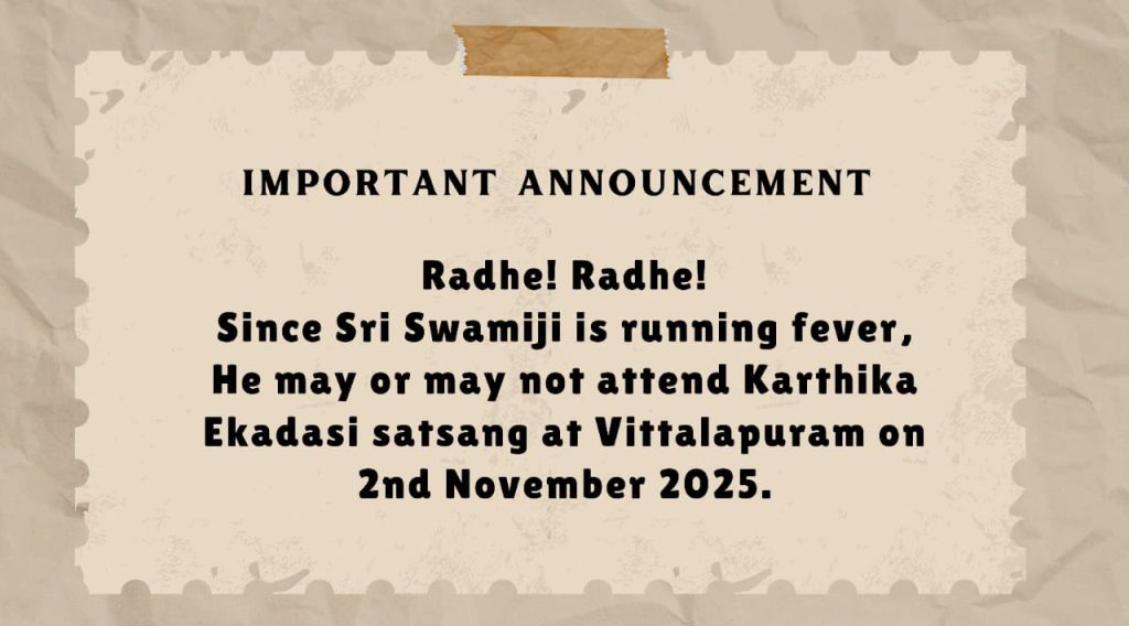 Sri Kalyana Srinivasa Perumal Dasar Sri. Pammal Balaji Bhagavthar conducted various satsangs as follows: 1. 01/11/2025 – Satsang at Mahanyam Village 2. 02/11/2025 – Morning Ekadasi Nama Chanting at Sri Pandurangan Sannidhi in Sri Kalyana Srinivasa Perumal temple along with all the devotees. 3. 07/11/2025- Satsang at Mahindra World City 4. 08/11/2025 & 09/11/2025- Participated Read more
