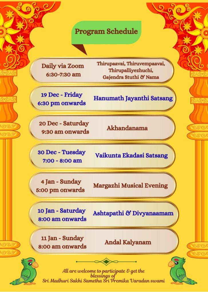 On December 19th morning, Sri Swamiji participated in Dhanur masa Pooja of Sri Premika Srinivasa Perumal. Later, He participated in Hanuman Jayanthi celebrations of Sri Kanyakumari Jaya Hanuman at Madhurapuri Ashram. He left Chennai and reached Tirunelveli by evening. On December 18th evening, Sri Swamiji participated in a Bhajan at MadhuraMurali Bhavanam. On December 17th Read more