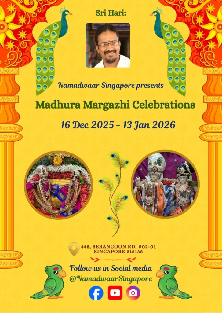 Singapore Namadwaar was invited by Sri Perumal Temple to host a lecture series by Brahmasri Janardhanan Ji on Andal Vaibhavam from December 11th, 2025, to December 13th, 2025. Over the three days, Brahmasri Janardhanan Ji took the audience through the advent of the twelve Alwars on the first day, the significance of Bhakti and Sri Read more