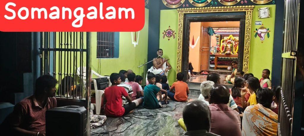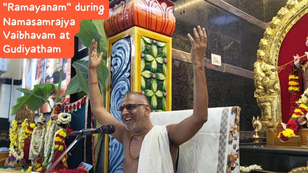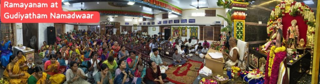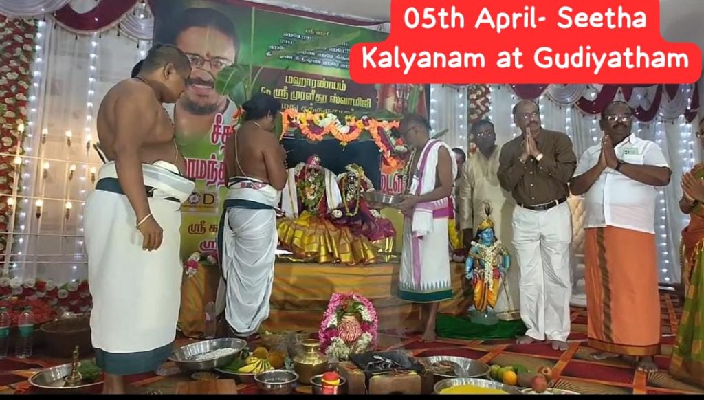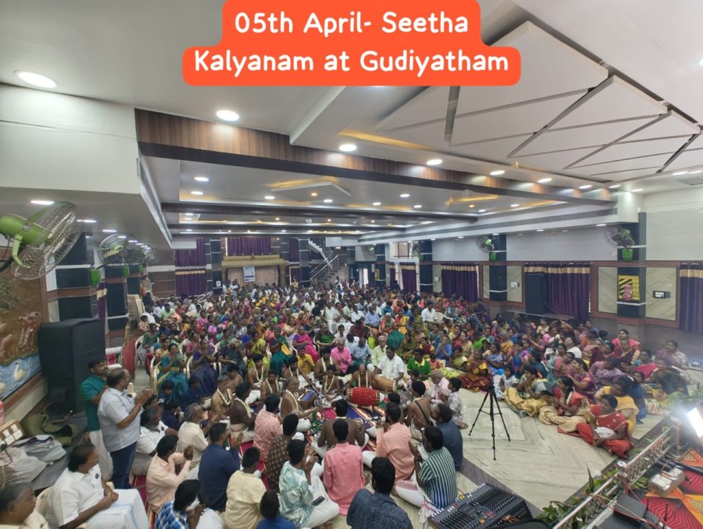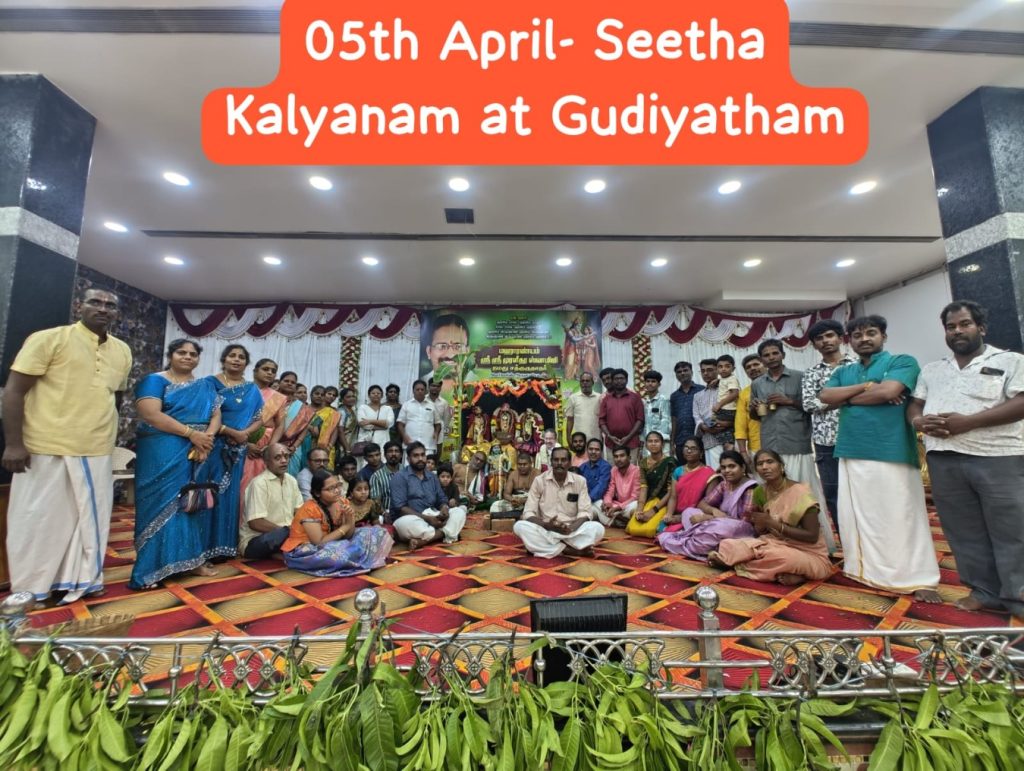With the blessings of Sri Guruji, on account of Sri Rama Navami, starting from February 17th for the 48 days Mahamantra Satsang was organised by Gudiyatham Namadwaar at 70 places particularly in Ramar temples in and around Gudiyatham, Vellore, Ambur, Anaicut and Walaja. This was well received by the village people and Nama kendra was started in many new villages. To mark it’s grand conclusion, Sri Ramayanam discourse by Kalyanasrinivasa perumal dasar, Sri. Pammal Balaji Bhagavathar was conducted at Gudiyatham Namadwaar from 27th March to 05th April. This was attended by more than 300 devotees daily. On 4th April, Grand Nagarasangeerthan around Namadwaar was conducted and the satsang concluded with Nama Samrajya Pattabhishekam to Sri Guruji’s holy padhukas. More than 500 devotees attended the satsang on that day. On 5th April a grand seetha kalyanam was performed at Sri Vaishnavi Mahal, Gudiyatham. This series of Satsangs concluded with grand mass prayer by Sri. Pammal Balaji Bhagavathar was attended by around 1000 devotees. Annadanam was performed on all days.