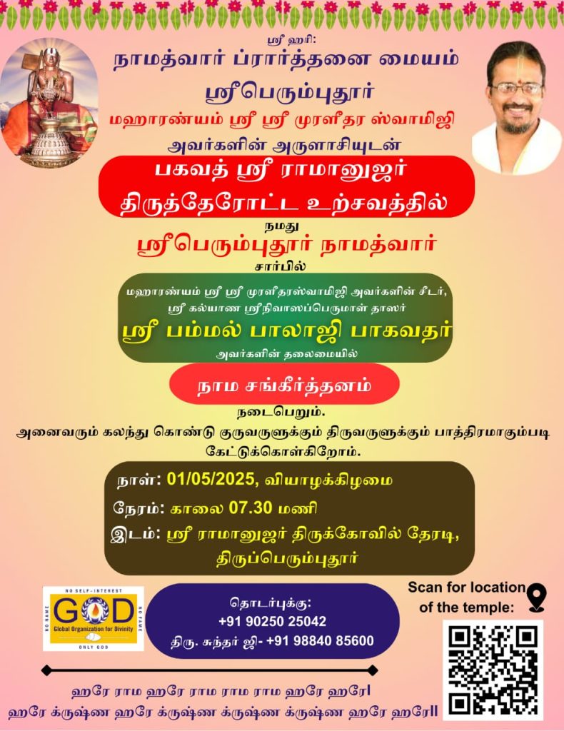 Radhe Radhe. Humble Namaskarams to Guruji Maharaj’s Lotus Feet. It would not be a stretch to aver that Guruji Maharaj fills the “Invisible Potholes of Life” with Immaculate Dexterity, through Adroitly-Sculpted Anugraha Bhaashan, Nama Sankirtan and other Spiritual Programs, woven ever so assiduously. The ensuing Nama Sankirtan, scheduled to flower and flourish through the Versatile Sri Pammal Balaji Bhagavathar (the “Gifted” Sri Kalyana Srinivasa Perumal Daasar) in the Pristine Pure Premises of “the Ever-Glittering and Effervescent ‘Hallowed Nama Lawns’ of Sriperumbudur” is yet another Chapter that is carved to bestow ” Pleasure beyond Measure ” on Everyone, for sure! Thankful to Self-Luminous Guruji!