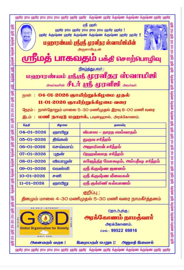 By Sri Swamiji’s grace, satsangs were conducted around Virudhunagar between 19th-25th January’26 by Sri Muraliji at 14 Kendras and Virudhunagar Namadwaar. More than 1000+ devotees participated actively & chanted Mahamantra in these satsangs Read more