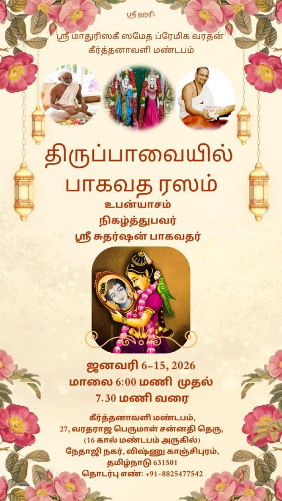 Between December 22nd and 28th, Sri Swamiji participated in Srimad Bhagavatha Parayanam at a devotee’s residence in Tuticorin. In the evenings, He delivered Srimad Bhagavatham Lecture at Subbiah Vidyalayam School which was attended by over 1000 people on all days. He also participated in Margazhi Veedhi Bhajan around Tuticorin Namadwaar, visited Nama Kendras and devotees Read more