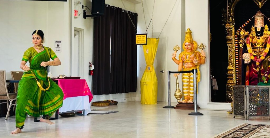On the auspicious occasion of Vijayadasami on October 2, devotees and children chanted Mahamantra with enthusiasm and also danced with kolattam for the Mahamantra. Earlier, Lakshmi ashtottra archana was performed and prayers were offered to Bhagavan. A bhajan class for kids was also commenced at the temple on this day.