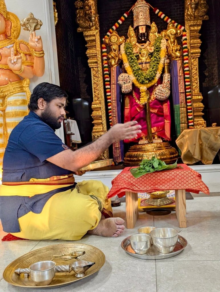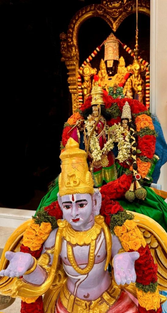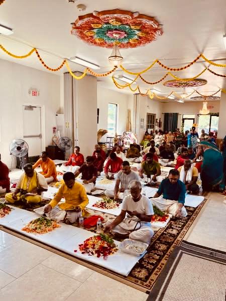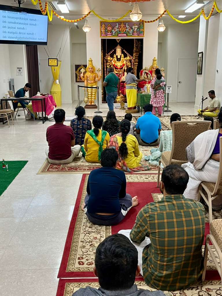 On October 4, on the auspicious Purattaasi Shravana Nakshatra day, Sahasranama Laksharchana was performed at the temple. About 45 devotees utilized this rare opportunity to offer archana themselves to Perumal with the 1000 names of Vishnu and filled the minds of guests with contemplation of Bhagavan and His divine grace. The entire Sahasranama archana was performed 3 times by the devotees, thus making it a Laksharchana. The event concluded with Maha Harati and a special, traditional ‘sit down’ lunch served on banana leaves for all devotees.