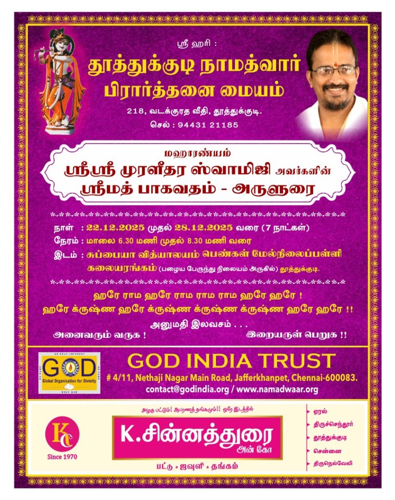 Radhe Radhe. Pranams and Prostrations to Guruji Maharaj’s Holy Feet. Guruji Maharaj’s Grace is perched on that Pedestal where we run out of words to describe, appropriately! The above Notice of Satsang at Tuticorin is threaded so aesthetically and it a visual treat, indeed! Srimad Bhagavatham discourse by our Reverential Master stirs our keenness and eagerness beyond measure! ‘A canter in the rain’ [hazardous] situations get thwarted when we listen to Enlightenment-Encompassed Guruji Maharaj’s Anugraha Bhaashan! Thankfulness, in spades, to Guruji Maharaj for sculpting the above delectable edition in the ‘Nama Muthu Nagar’ [Tuticorin]!