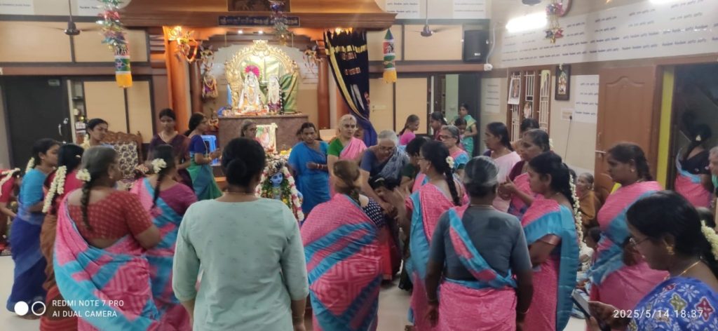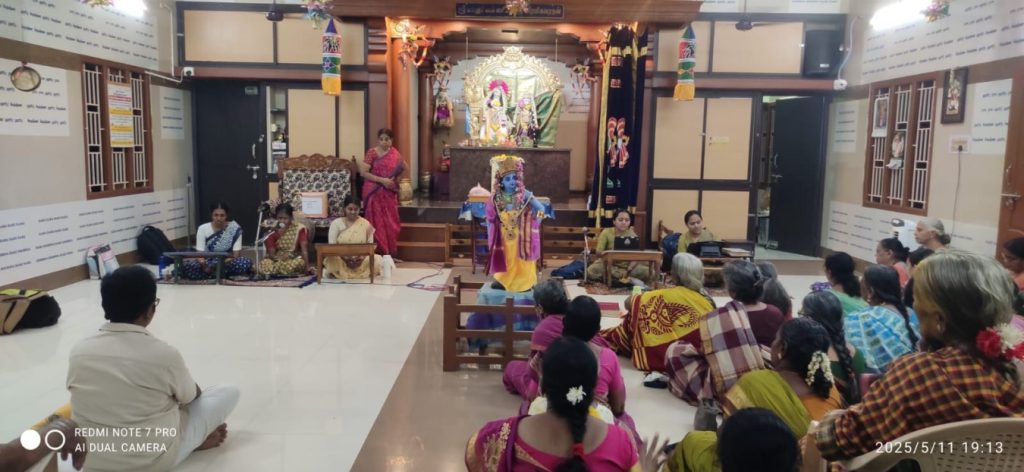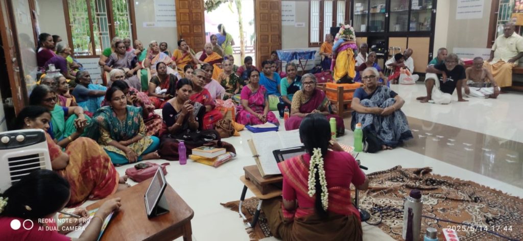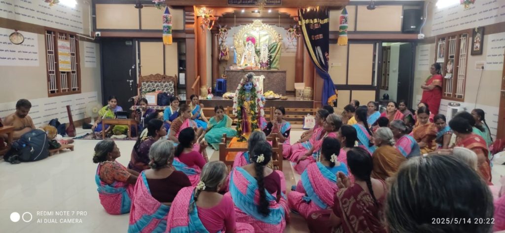 Radhe Radhe. Reverential Salutations to Guruji Maharaj’s Holy Feet. Our hearts brim with Immense Pleasure to see 1. The Wonderful Decorations to Sri Madhuri Sakhi Samedha Premika Varadan 2. Lord Krishna’s Loving Countenance, contagiously spreading Untrammelled Glee, His Stance, Attire and Floral deck-up rejuvenating our spirits by several notches. 3. The delightful conglomeration of the ‘Blessed Mahila Devotees’ looking Admirable, absolutely immersed in this Incredible Satsang lasting for seven days – the Effusive Events that they are going to cherish for several years! Srimad Bhagavatham, especially Udhayasthaman, is so rich in design and effervescent in content, is certain to trigger, shower of Torrential Blessings from our Reverential Master – that will keep them in good stead, forever! Grateful to Guruji Maharaj for this full throttle Satsang that proliferates Unequalled Bliss on Everyone. Heartfelt Salutations to all the Organizers from Thanjavur Namadwaar and all the’Elite Mahila Mandali’ for execution of this Grand Satsang (their Uniform is adorable), with finesse and flourish!