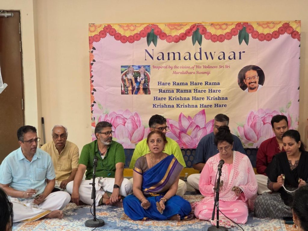 Preparations began early at 7:15 am, with Namadwaar teams assembling to set up the venue. After the stage arrangements were completed and the hall was readied with the temple staff’s support, the program commenced promptly at 8:00 am.
