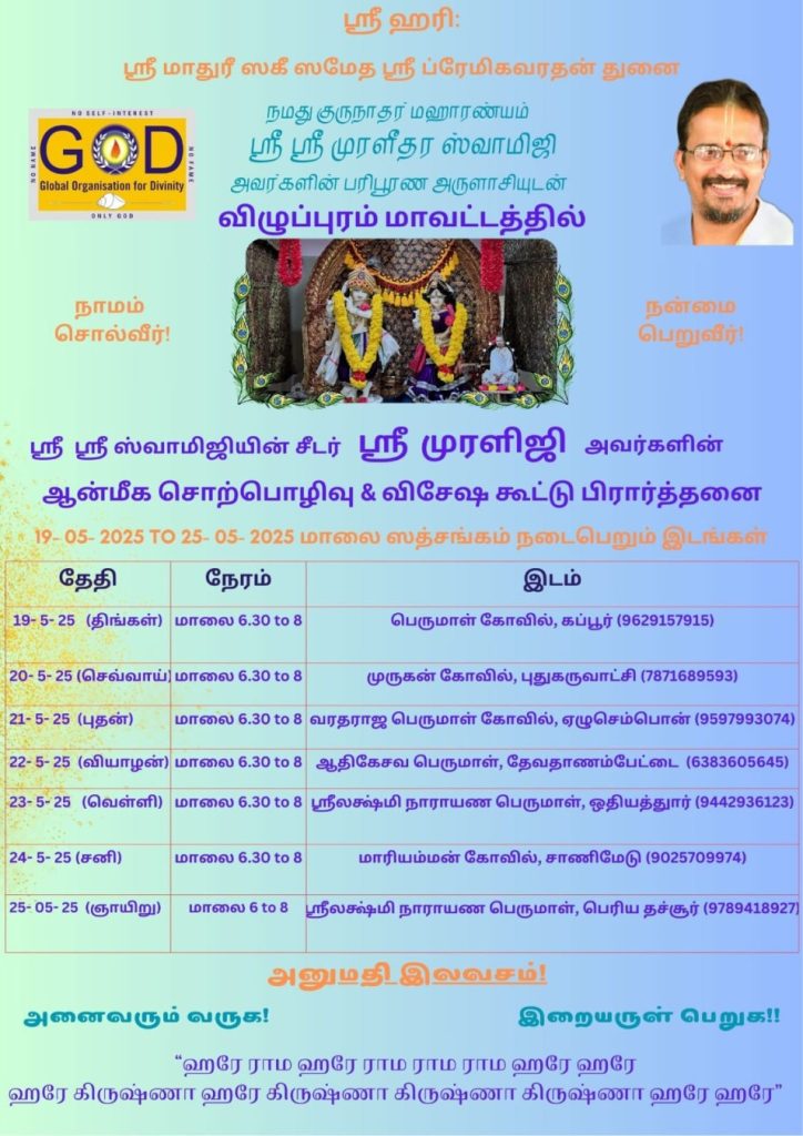 Radhe Radhe. Humble Namaskarams to Guruji Maharaj’s Holy Feet on the auspicious Guru Vaaram day ( Thursday). That a slew of Satsangs are going to blossom through the Dexterous Hands of Sri Muraliji in Villupuram is bringing cheers to all the devotees residing in that area. Inexorably our minds do not possess positional filters and Satsangs of this nature and stature infuses us with clarity, thereby reducing margins of erring to infallible levels. The flair and fluency with which the Satsangs are threaded, surely would evoke a trove of positive thoughts paving the way for a prosperous future. Grateful to Revered Guruji!