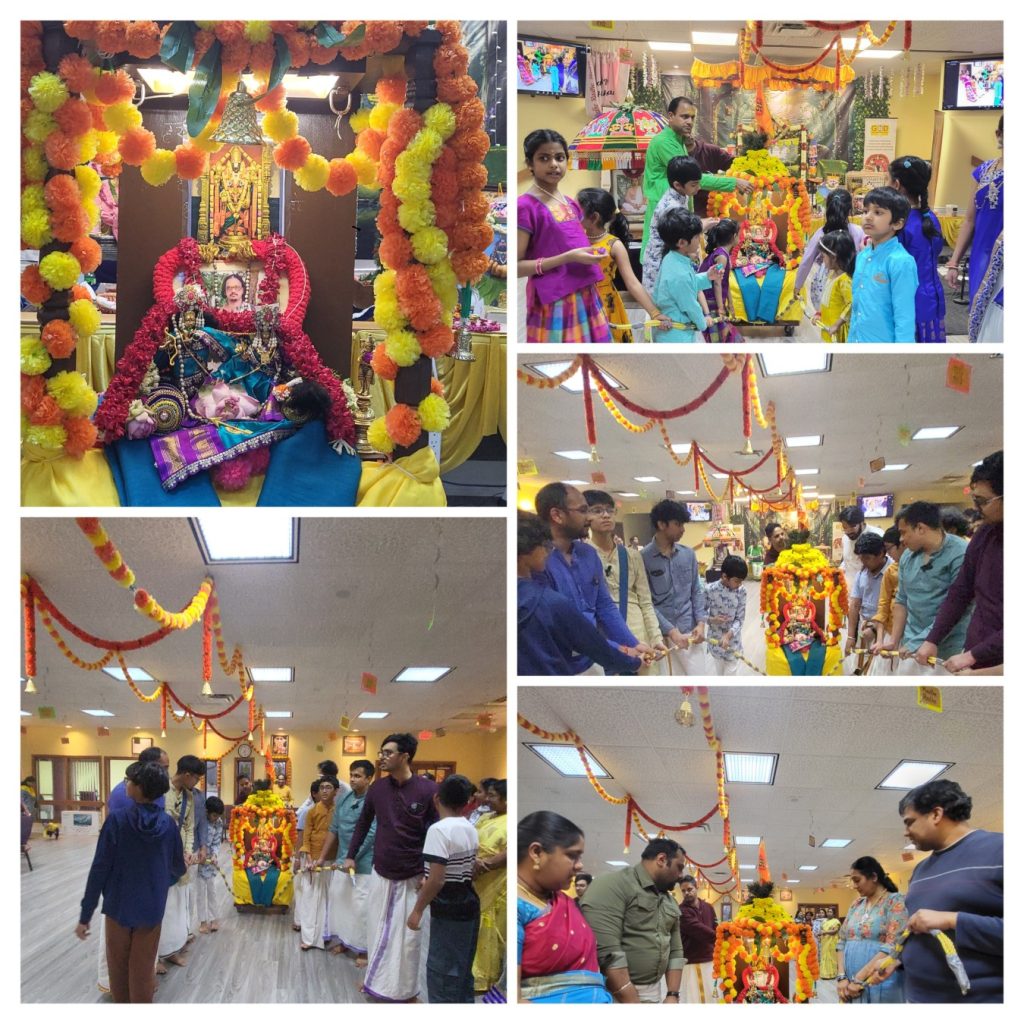 Culimination of Navaha Parayanam Pattabhishegam was grandly celebrated on March 28, with joy & pomp reflecting the coronation of Sri Sita and Rama, followed by Rathotsavam during which each family took turns to pull the Ratham amidst singing of Bhajans and Namavalis.