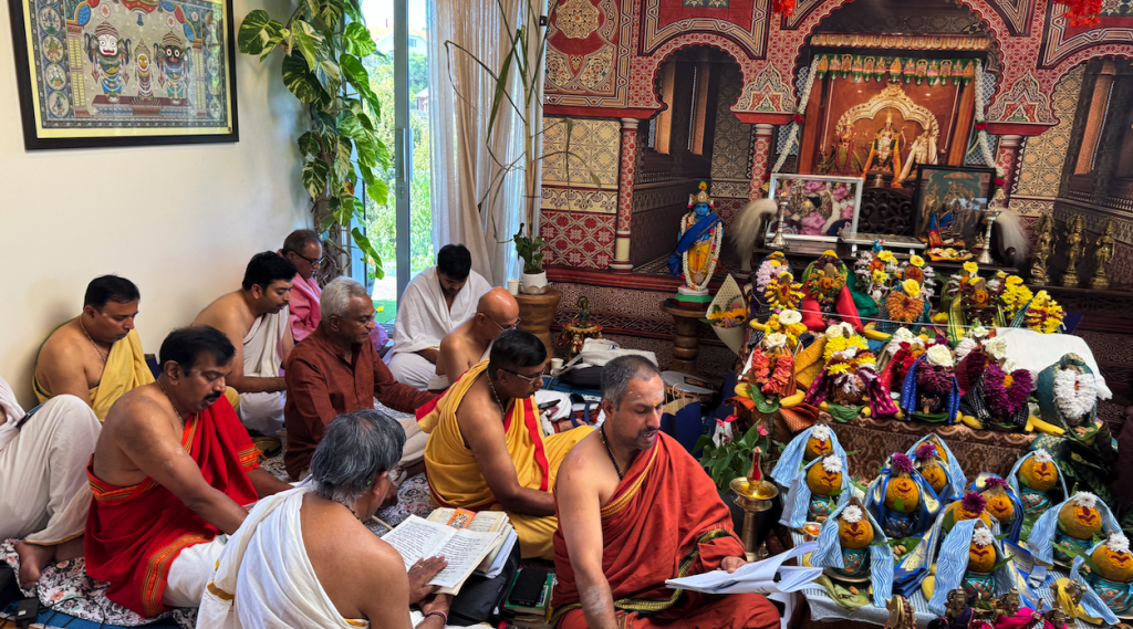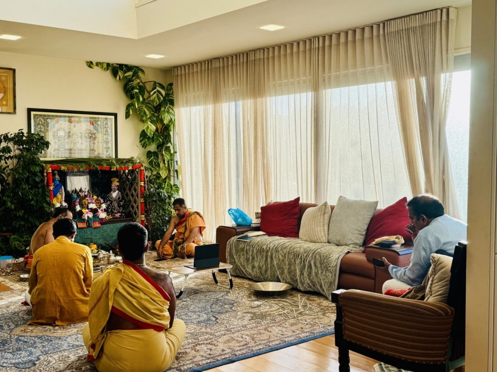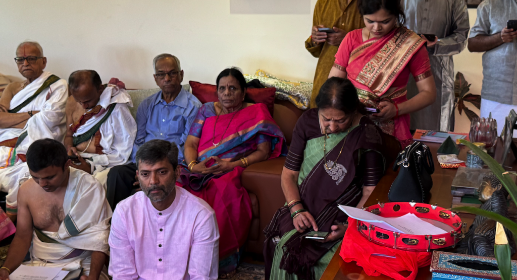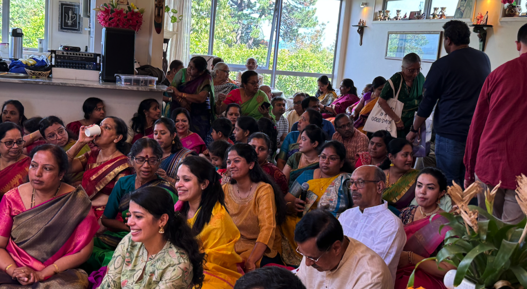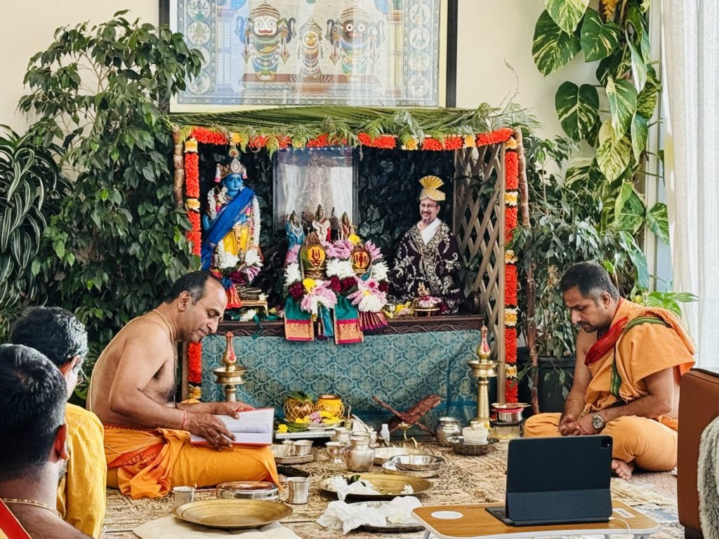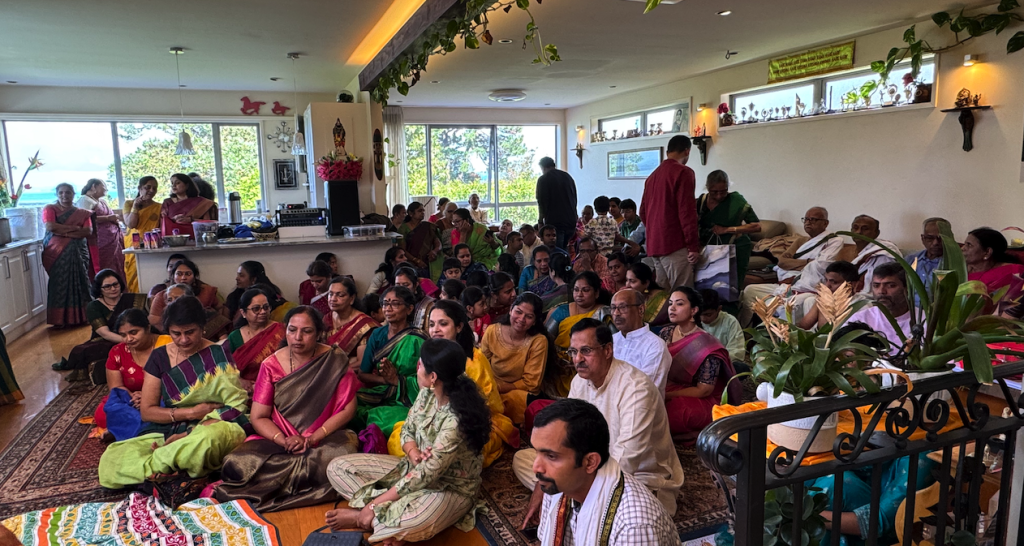 By the grace of our beloved Guru Maharaj, New Zealand Namadwaar celebrated Rama Navami with a month-long activity. A Punarvasu Parayanam started with Vinayaka pooja and Kalasha Sthapana on the 9th of March 2025. For 27 days, the Parayanam of Shrimad Valmiki Ramayana was done every morning at 5:30 am with an average participation of 5 to 7 people. This reading session included singing Madhurageethams and compositions of other Saints in relevant and significant chapters. One notable occasion during the Parayanam session was day 9 of Parayanam when Shri Rama Paduka Pattabhishekam was read; on this occasion, Paduka Pooja was offered to Guruji’s Paduka.