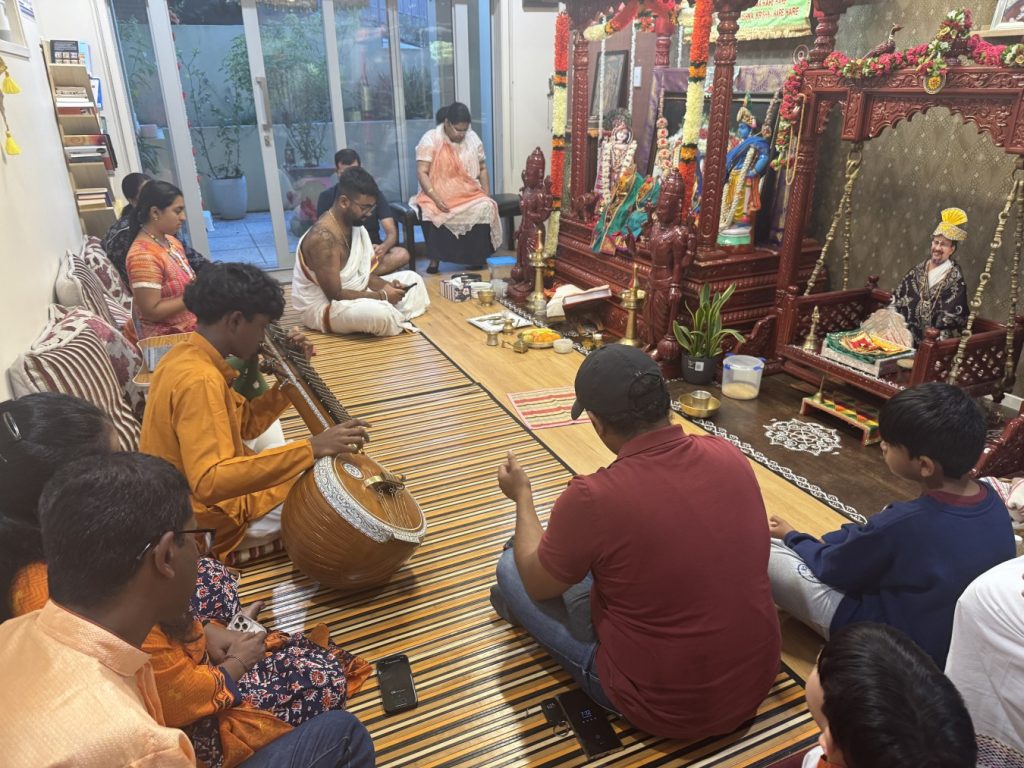 Smt. Sumathi Vishwanath, Sri Sathyakumar Katte, Smt. Lakshmi Subramanya, Smt. Shubhaprada Ravi, Dheeraj Venakatachalam, and Adhira Venkatachalam regularly offered bhajans and devotional singing.Shri Rama Pattabhishekam was celebrated grandly on Rama Navami. Holy waters from 8 rivers (7 from India and one from New Zealand) and the four oceans were brought in from across the globe for the Samrajya Pttabhshekam. Kalasha sthapana of Rama Kutumbam, Ashta Dikapalas, Navagrahas, Shri Mrityunjaya, the Saptarishis and all other Devathas were done. After that, a Samuhika Parayanam of the Pattabhishekam Sargam of Shrimad Valmiki Ramayana was done; about 40 devotees participated in this Samoohika Parayanam. A Kireetam (crown) was offered to Bhagavan during the Parayanam. After Parayanam, the Samrajya Abhishekam was performed to Shri Rama with all the river and ocean waters, while all the devotees showered flowers and puffed rice. There was mass chanting of Rama Taraka Mantra by all the devotees present. The Abhishekam was followed by a small Purappadu for Shri Rama with Bhajans. Shri Rama Pattabhishekam was made grand by 220 people participating in person and many more on Zoom.