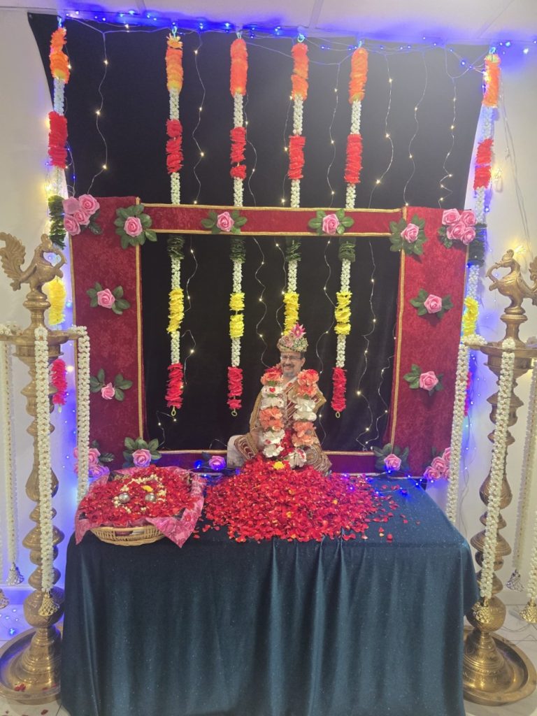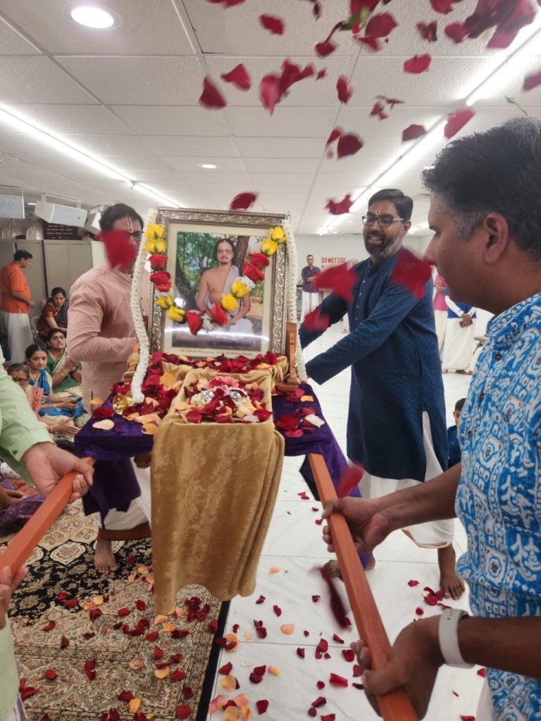 On October 25, the devotees continued the celebrations with a vibrant Purappadu for Sri Swamiji. Both adults and children joyfully took turns carrying the palanquin bearing Sri Swamiji’s picture and the Holy Padukas that were beautifully decorated with flowers. The Purappadu was filled with devotion and gratitude as devotees swayed and danced to Guru Kirtans, chanted Nama, and performed Pushpavarsham. Devotees lovingly made garlands with colorful flowers that were offered to Sri Premikavaradha Takurji and Sri Swamiji.