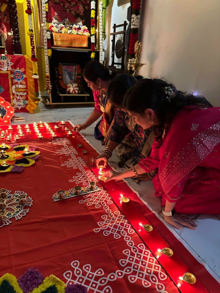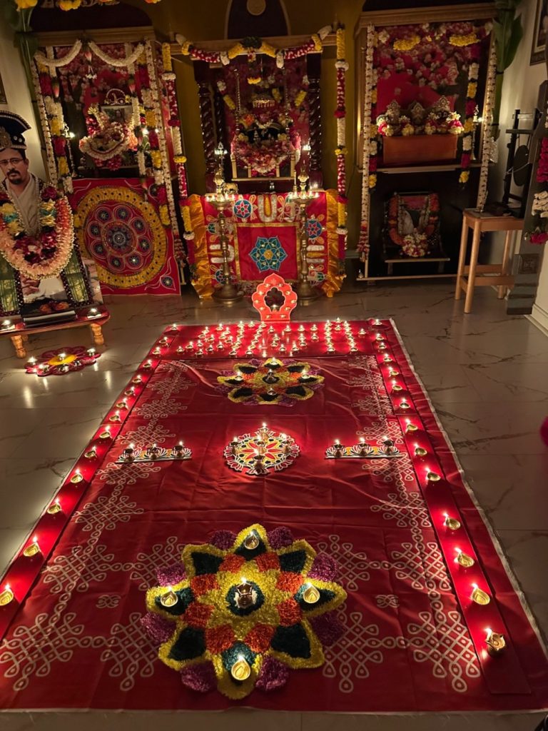 On Deepavali day (October 19th), the satsang commenced with Mahamantra Kirtan, Guru Vandanam, and Lakshmi Pooja. This was followed by a beautiful Deepotsavam, where devotees lit lamps at Namadwaar. Madhurageetham kirtans on Sri Swamiji, Lord Krishna, Radha, and the Divine Yugalam were joyfully rendered. The celebration concluded with Mahaprasad and fireworks, filling the atmosphere with devotion and festive joy.