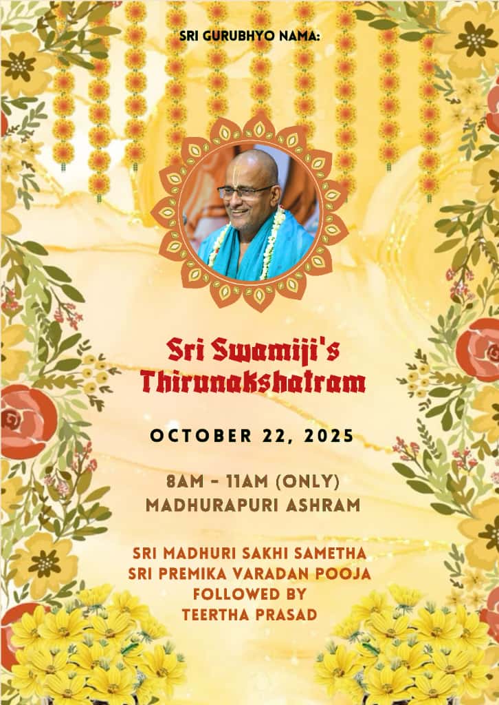Sharada Navarathri utsavam was celebrated at Singapore Namadwaar centre in 2025, with the blessings and guidance of our Guruji, His Holiness Maharanyam Sri Sri Muralidhara Swamiji, and in the auspicious presence of our beloved deities, Sri Madhurisakhi samedha Sri Premika Varadhan. The entire program was guided by Brahmasri Janardhananji and conducted with enthusiastic devotion by Read more