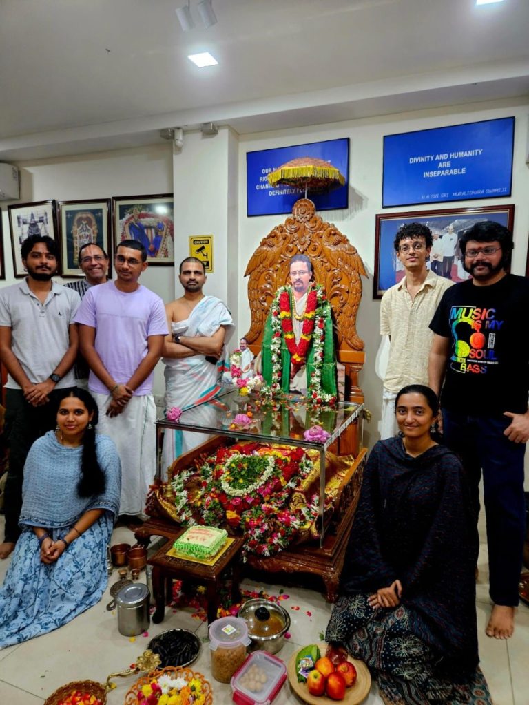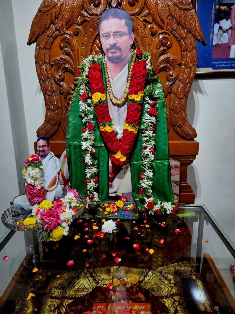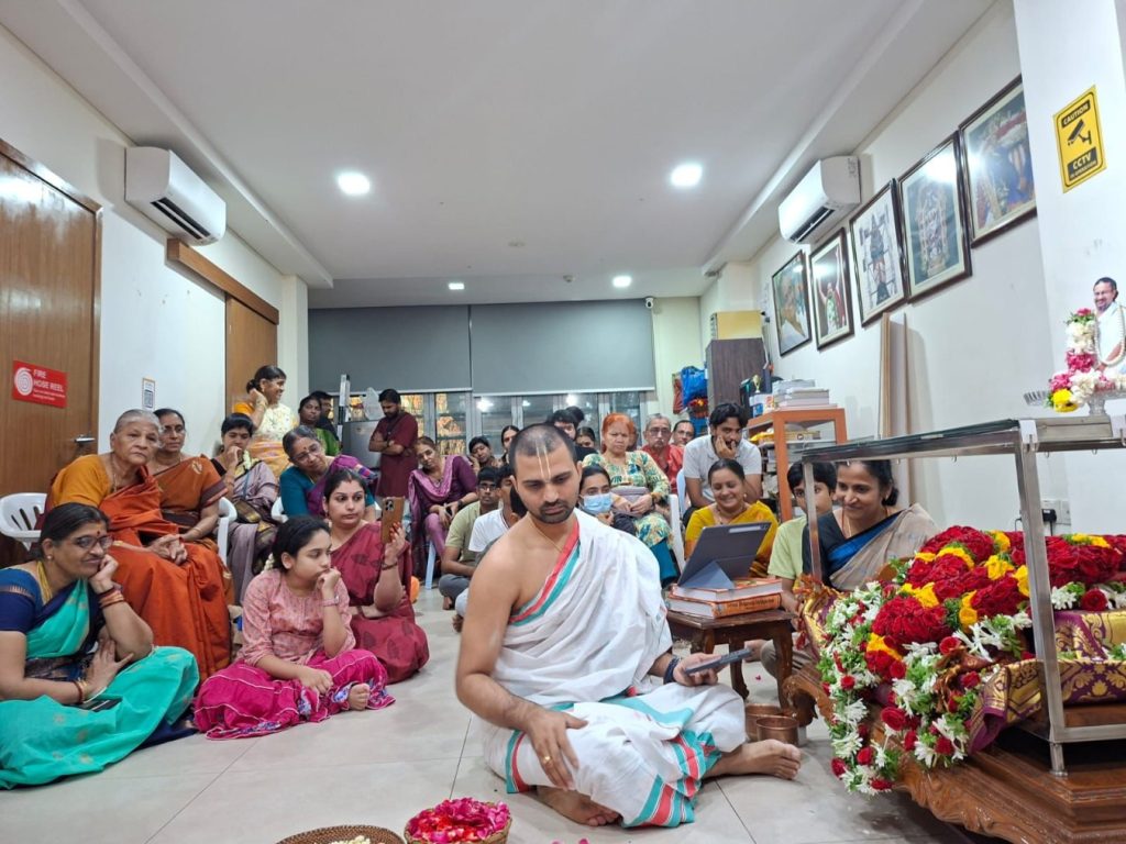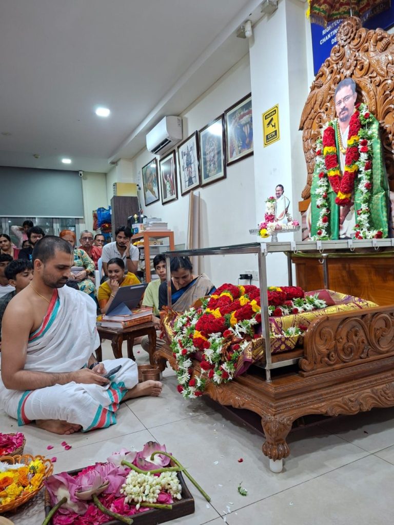 The sacred celebrations opened with the chanting of the Mahamantra and singing of Madhurageethams, as devotees lovingly reminisced about our Guru Maharaj’s boundless compassion and blessings. This devotional atmosphere was further enriched when Brahmasri Janardhananji delivered a deeply moving discourse, illuminating how truly blessed we are to have our Guru Maharaj, a divine embodiment of infinite maternal love (koti vatsalyam) who continuously showers us with unconditional care and affection.
