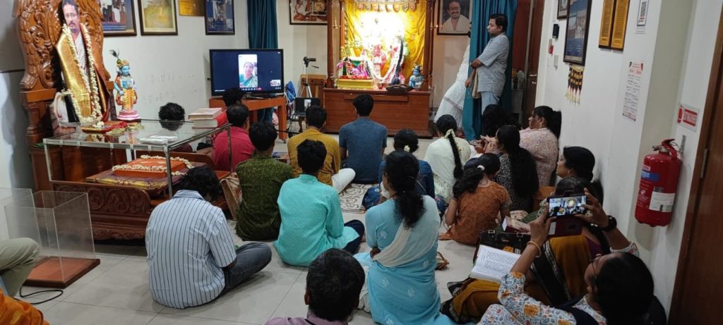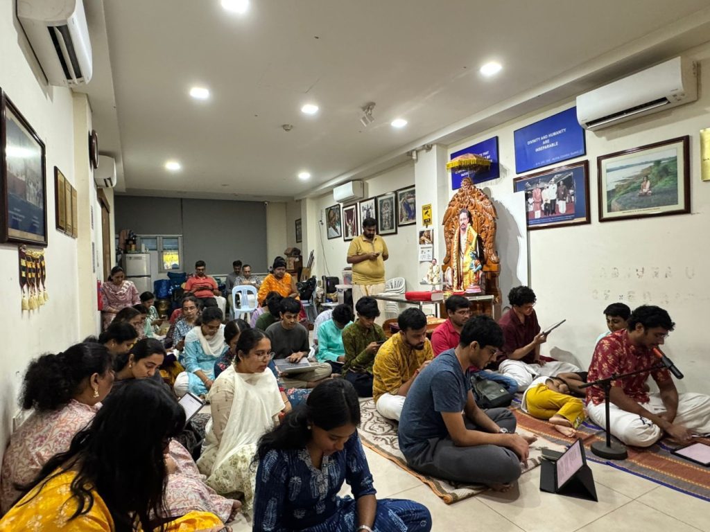 The evening commenced with the chanting of the Mahamantra, followed by an inspiring sharing session by Dr Janani ji. She spoke to the youth team about how dear Srimad Bhagavatam is to Sri Guruji, and how seeing young Namadwaar family members undertaking the parayanam of Srimad Bhagavatam would bring Him immense happiness. She also encouraged the youth team members to continue their parayanam and gradually deepen their understanding chapter by chapter, to immerse themselves in the bliss of Srimad Bhagavatam.