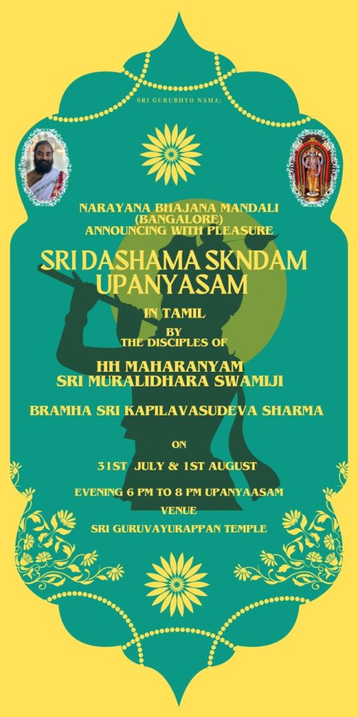 Radhe Radhe. Bow my head, with utmost Reverence, to Guruji Maharaj’s Lotus Feet that sculpts Satsangs that are ‘Refreshingly Rooted’, enables us discard polarized lenses and assuages our hearts soothingly so that we can savour Treasured and Enduring Bond with Him, perpetually. Underlying the veneer of “Joyous Journey”, there are layers of complexity that can be won over effortlessly, through His Grace, ONLY! The cited, delectable information, proclaiming Srimad Bhagavatham Lecture at Guruvayoor by Brahmasri Kapilavasudevan has a “Sharp Uptick” on several counts and is that Engrossing Confluence of – Sri Dashamaskandam Upanyasam, in the Sanctified Space of Sri Guruvayurappan Temple! History bears Astounding Testimony [courtesy : Our Guruji Maharaj’s Enchanting Anugraha Bhaashan only!] that our Beloved and Respected Guruvayurappan, dances with gay abandon, when He listens to Sri Dashamaskandam Upanyasam! Gratification to Guruji Maharaj for chiselling this “Fulsome Satsang” that is bound to shower Towering Blessings on Everyone!