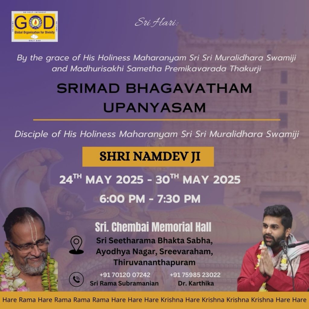 Radhe Radhe. Reverentially Prostrate before Guruji Maharaj’s Holy Feet. Even the address, where Srimad Bhagavatham is scheduled to be conducted by the Precocious Shri Namdevji, is soaked in Divinity!! Seetharama Bhaktha Sabha, Ayodhya nagar, Sreevaraham – how lovely it is! Beyond debate, these Satsangs will be indelibly etched on the sands of Time for they possess the prowess to not only inject Enlightenment but also infuse untrammelled happiness, simply by listening to the Nectarine Discourses! Gratification to Guruji Maharaj for sewing our Spiritual Thoughts in fine rhythm and sowing the seeds of Harmonious Ambience in our milieu, through these Spectacular Satsangs!!