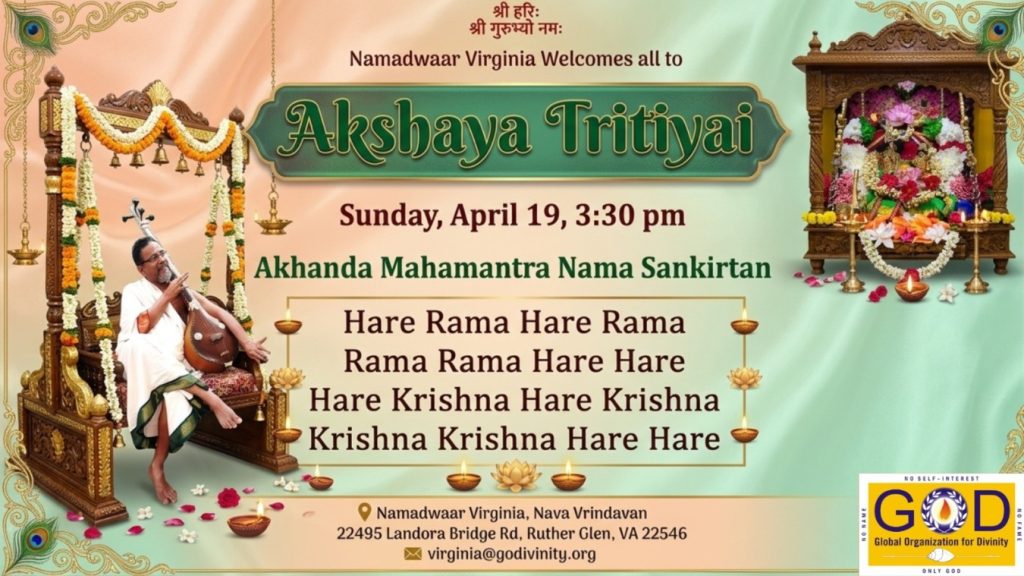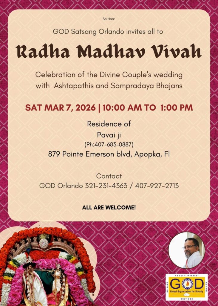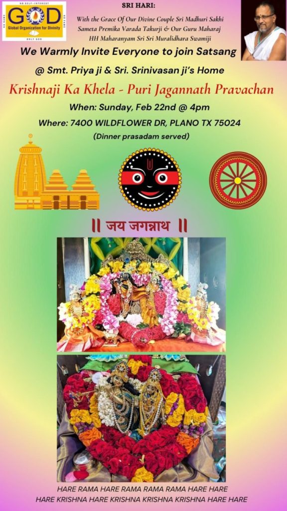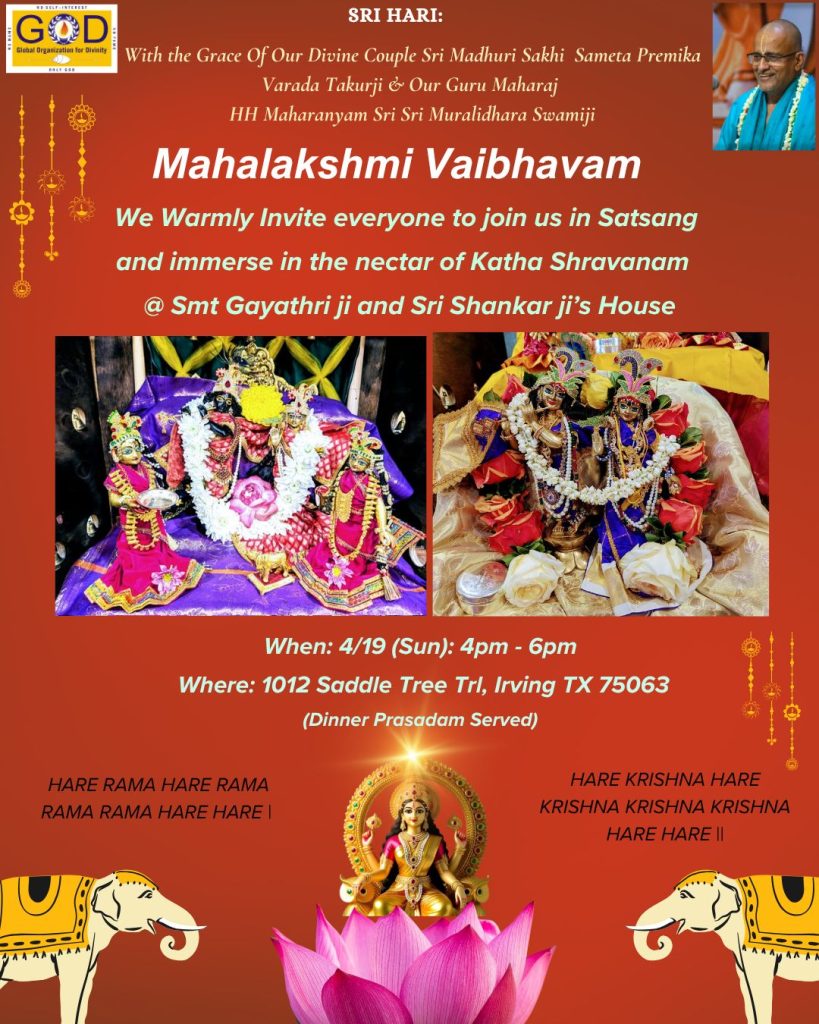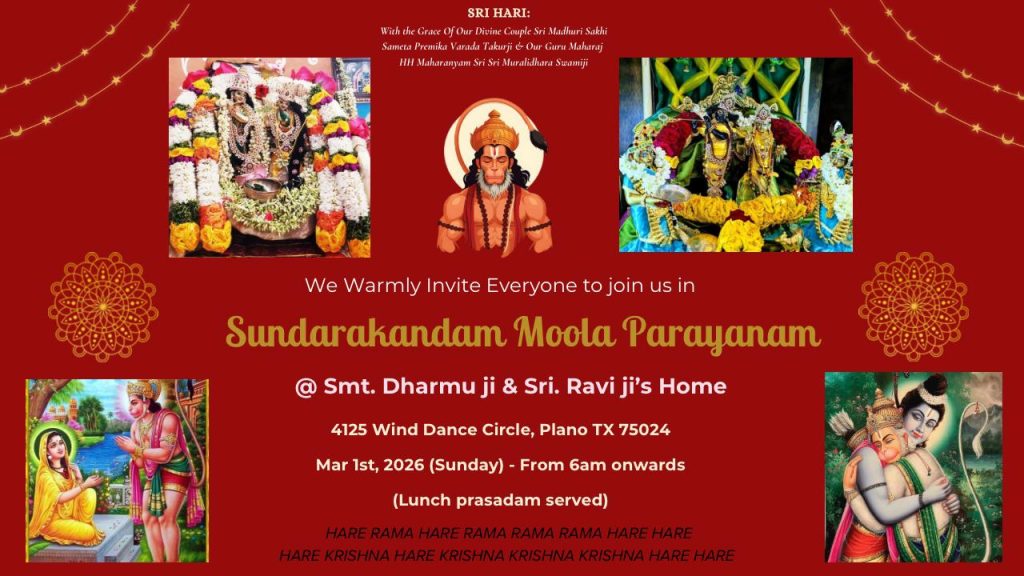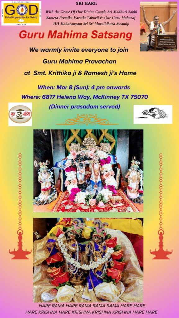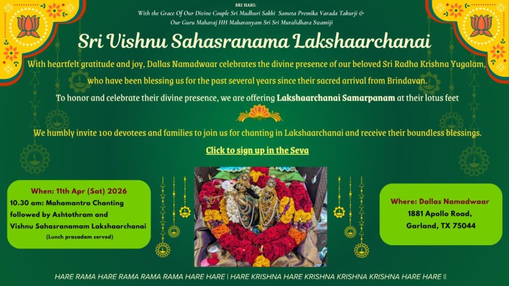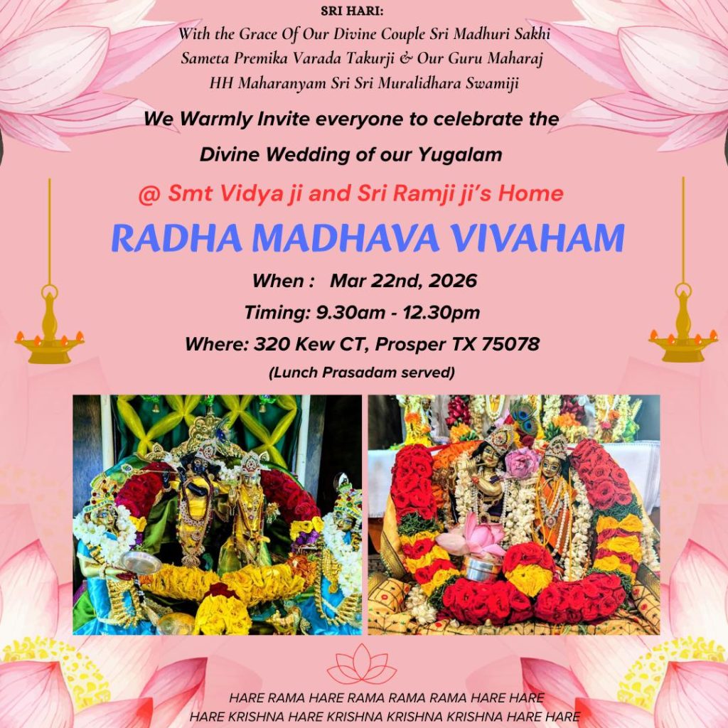 Radhe Radhe. Koti Namaskarams and Pranams to Guruji Maharaj’s Renaissance-Supreme Holy Feet that brings about Metamorphosis in the Cosmos, in entirety! Guruji Maharaj, an ‘Embodiment of Peace’, is that Divine Architect who has produced an Enchantingly Enduring Legacy that remains Etched Eternally, in our memory! The Lustrous Gems of Events, strung under the Caption, “Upcoming Satsangs in USA / Canada”, is mind-blowing, mildly stated! Excepting Guruji Maharaj’s Incalculable Grace, it is next to impossible to chart those Overwhelming Satsangs and we are definitely bewildered and dazed as to how such Sublime and Superior Programs can first of all be conceived, leave alone achieving Immaculate Execution! Even the Captions have the Efficacy to propel our thoughts to that ‘Bliss-encompassed’ levels! Flipping through the chronicle of events itself is a magical source of Joyousness that speaks eloquently about Guruji Maharaj’s Abiding Passion in elevating us to that Inconceivably Aggrandized Spiritual Levels, persistently! For context, each and every Invite is Rich in Design, Guruji Maharaj’s Divine Photographs [with different delectable postures] adorning them are Classy & Inspiring, Wordings embossed are out of the world [Gratitude Nama Mahamantra Nama Sankirtan, Radha Madhav Vivah, Gambhira Srinivasa, KrishnAji kA KhELA, Madhura Utsav, Narasimha Jayanti – Namadwaar Seattle (Sri Prahlad’s cute & humble posture, sitting on the Lap of Majestic Lord Narasimha, embracing Sri Prahlad is magnificent)] – succinctly, the whole enchilada is saccharine-soaked, out of the world, irrefutably! Thanks in tons to our Master Craftsman, Guruji!!