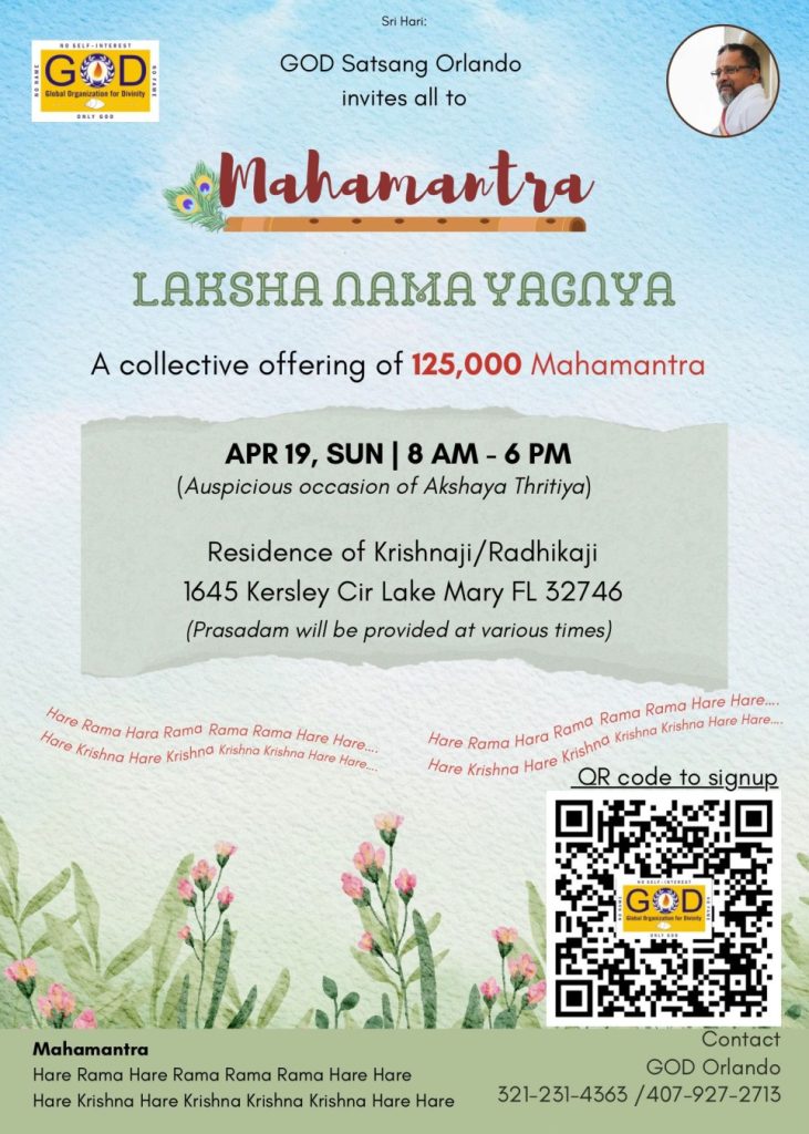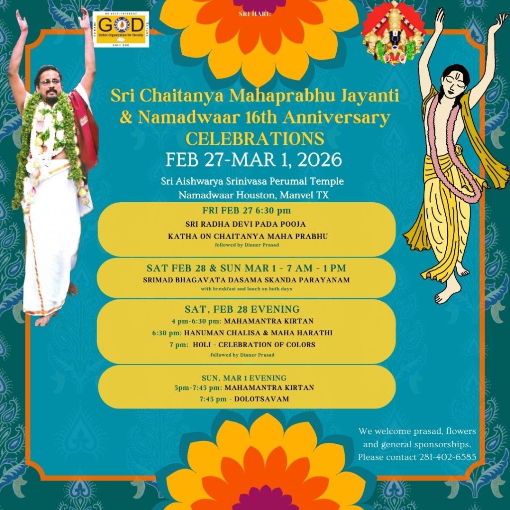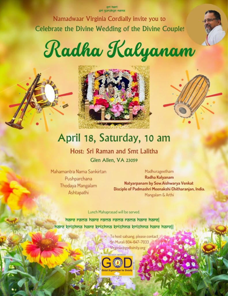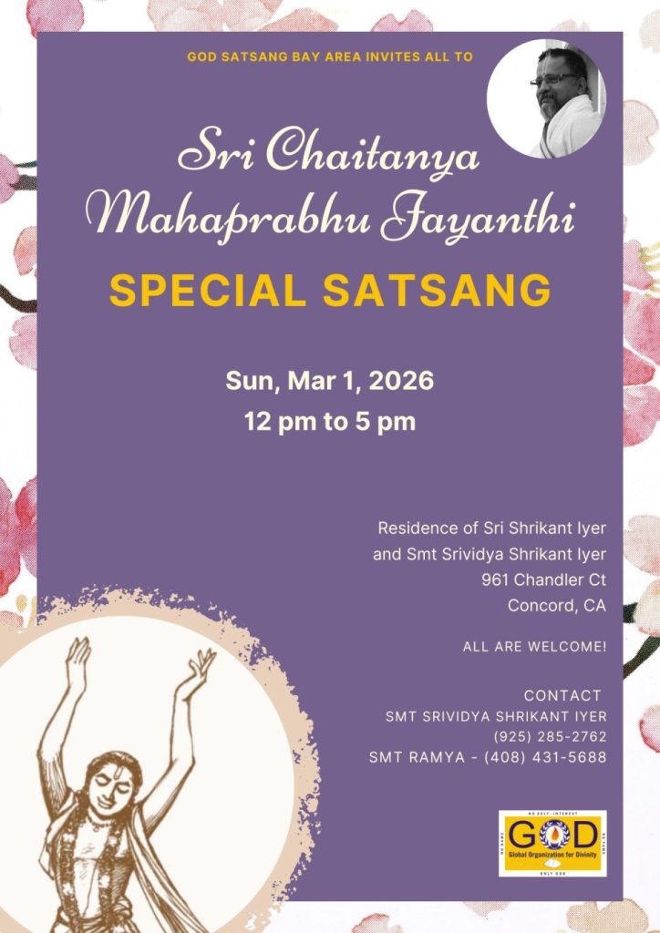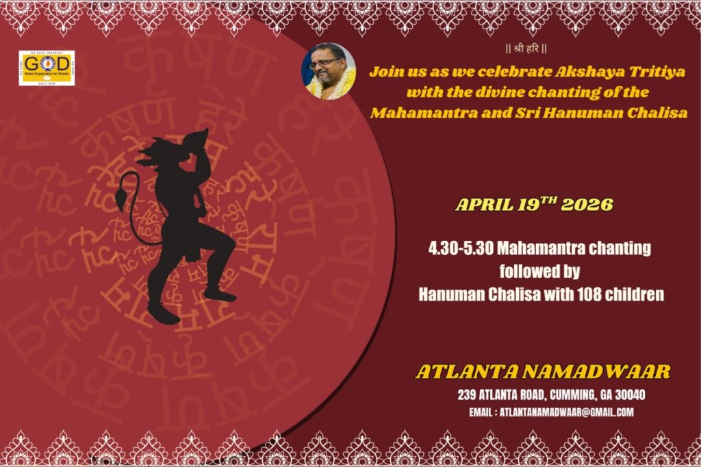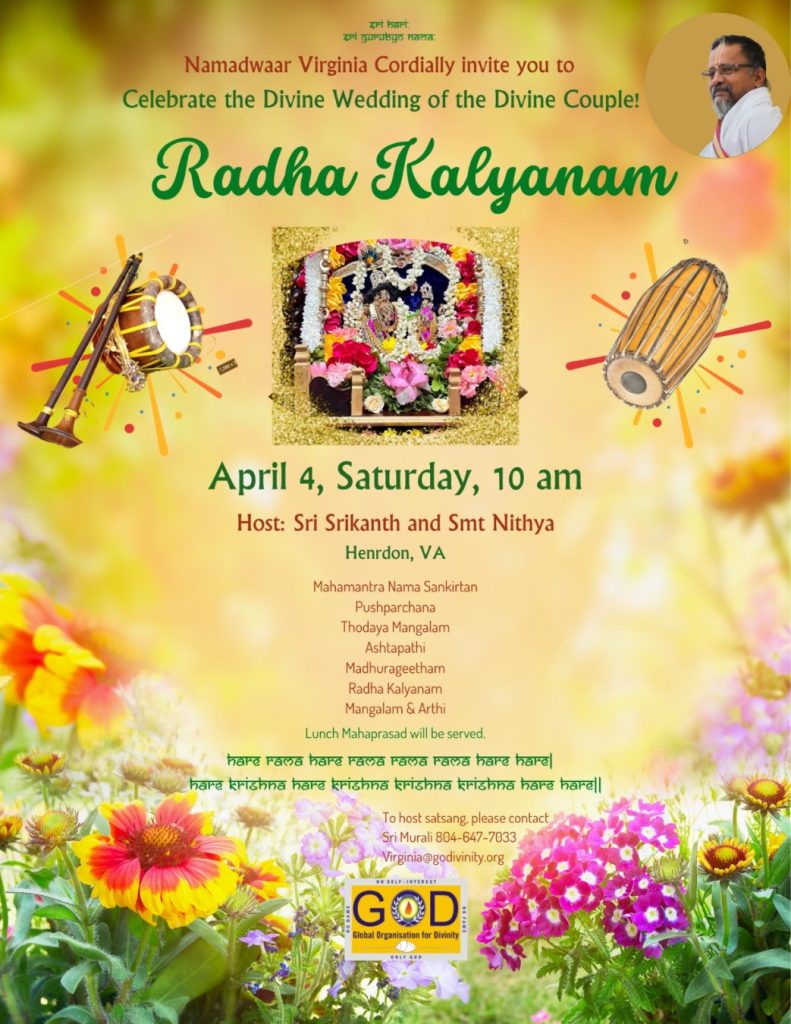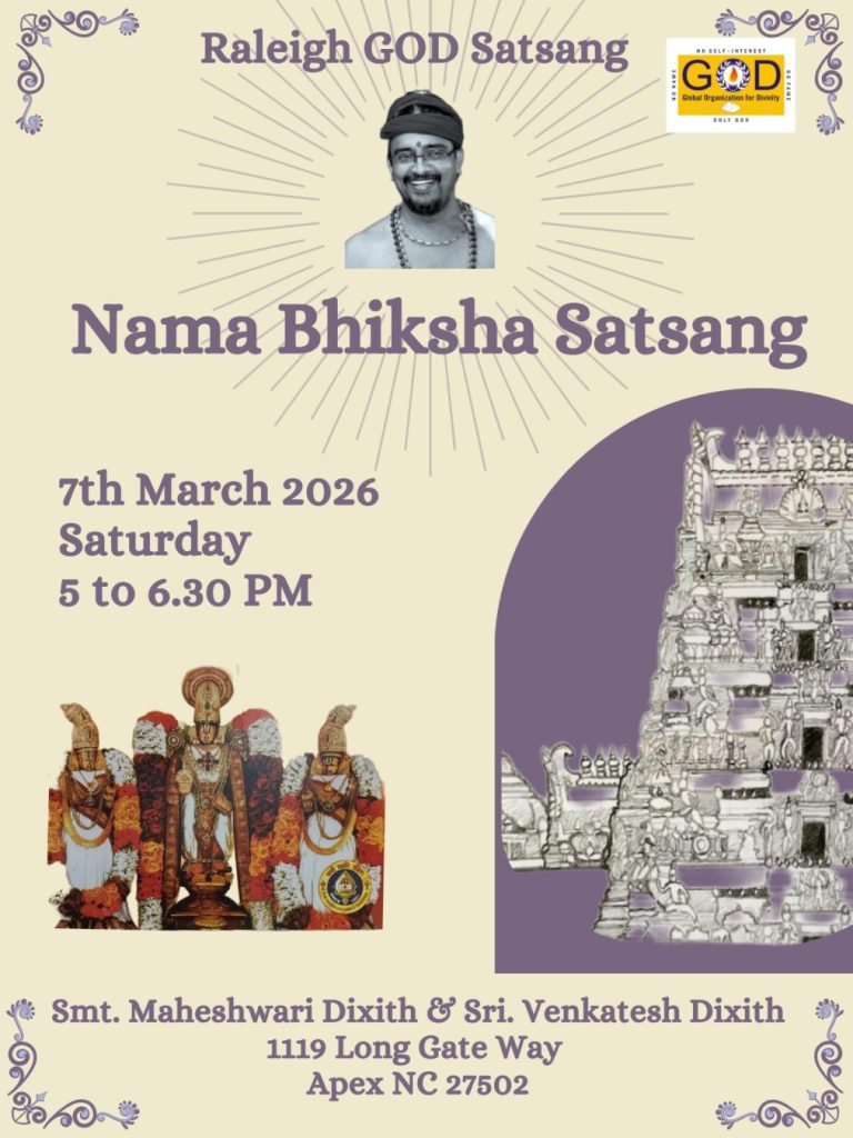 Radhe Radhe. Koti Namaskarams and Pranams to Guruji Maharaj’s Renaissance-Supreme Holy Feet that brings about Metamorphosis in the Cosmos, in entirety! Guruji Maharaj, an ‘Embodiment of Peace’, is that Divine Architect who has produced an Enchantingly Enduring Legacy that remains Etched Eternally, in our memory! The Lustrous Gems of Events, strung under the Caption, “Upcoming Satsangs in USA / Canada”, is mind-blowing, mildly stated! Excepting Guruji Maharaj’s Incalculable Grace, it is next to impossible to chart those Overwhelming Satsangs and we are definitely bewildered and dazed as to how such Sublime and Superior Programs can first of all be conceived, leave alone achieving Immaculate Execution! Even the Captions have the Efficacy to propel our thoughts to that ‘Bliss-encompassed’ levels! Flipping through the chronicle of events itself is a magical source of Joyousness that speaks eloquently about Guruji Maharaj’s Abiding Passion in elevating us to that Inconceivably Aggrandized Spiritual Levels, persistently! For context, each and every Invite is Rich in Design, Guruji Maharaj’s Divine Photographs [with different delectable postures] adorning them are Classy & Inspiring, Wordings embossed are out of the world [Gratitude Nama Mahamantra Nama Sankirtan, Radha Madhav Vivah, Gambhira Srinivasa, KrishnAji kA KhELA, Madhura Utsav, Narasimha Jayanti – Namadwaar Seattle (Sri Prahlad’s cute & humble posture, sitting on the Lap of Majestic Lord Narasimha, embracing Sri Prahlad is magnificent)] – succinctly, the whole enchilada is saccharine-soaked, out of the world, irrefutably! Thanks in tons to our Master Craftsman, Guruji!!