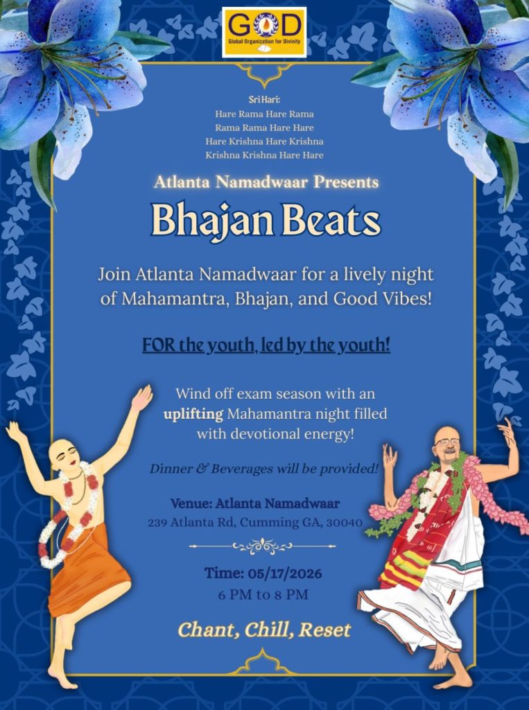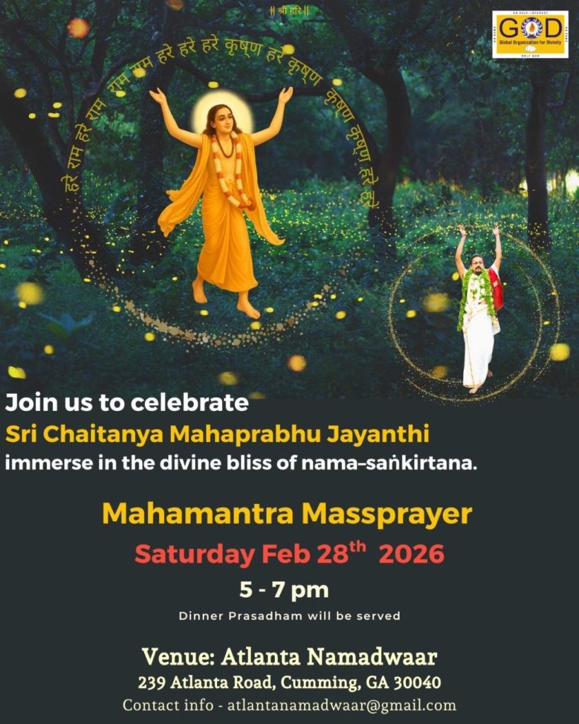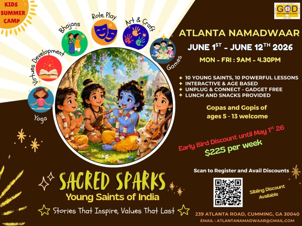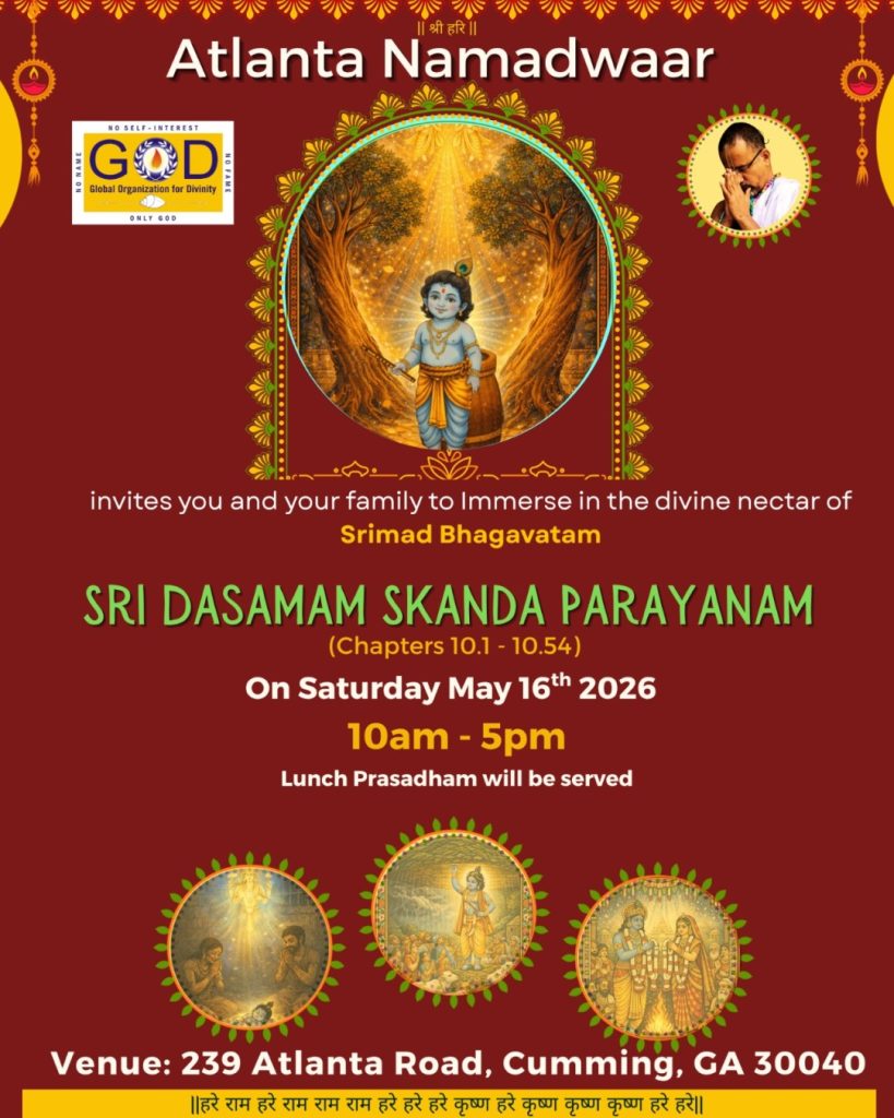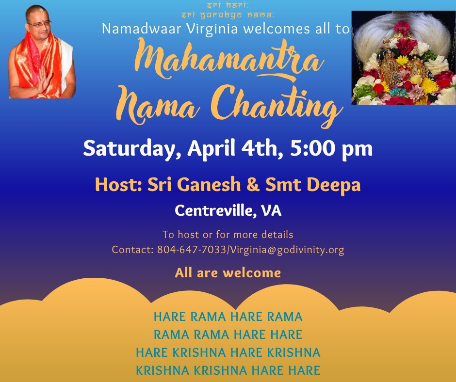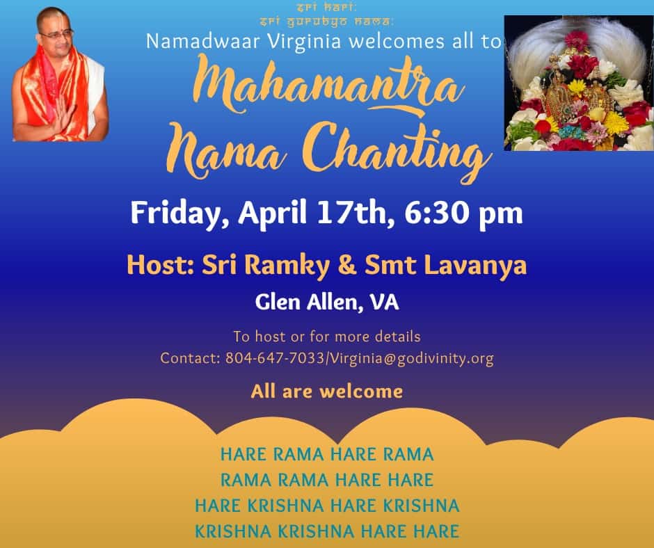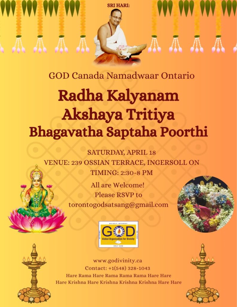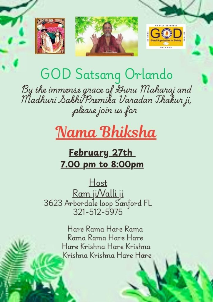 Radhe Radhe. Koti Namaskarams and Pranams to Guruji Maharaj’s Renaissance-Supreme Holy Feet that brings about Metamorphosis in the Cosmos, in entirety! Guruji Maharaj, an ‘Embodiment of Peace’, is that Divine Architect who has produced an Enchantingly Enduring Legacy that remains Etched Eternally, in our memory! The Lustrous Gems of Events, strung under the Caption, “Upcoming Satsangs in USA / Canada”, is mind-blowing, mildly stated! Excepting Guruji Maharaj’s Incalculable Grace, it is next to impossible to chart those Overwhelming Satsangs and we are definitely bewildered and dazed as to how such Sublime and Superior Programs can first of all be conceived, leave alone achieving Immaculate Execution! Even the Captions have the Efficacy to propel our thoughts to that ‘Bliss-encompassed’ levels! Flipping through the chronicle of events itself is a magical source of Joyousness that speaks eloquently about Guruji Maharaj’s Abiding Passion in elevating us to that Inconceivably Aggrandized Spiritual Levels, persistently! For context, each and every Invite is Rich in Design, Guruji Maharaj’s Divine Photographs [with different delectable postures] adorning them are Classy & Inspiring, Wordings embossed are out of the world [Gratitude Nama Mahamantra Nama Sankirtan, Radha Madhav Vivah, Gambhira Srinivasa, KrishnAji kA KhELA, Madhura Utsav, Narasimha Jayanti – Namadwaar Seattle (Sri Prahlad’s cute & humble posture, sitting on the Lap of Majestic Lord Narasimha, embracing Sri Prahlad is magnificent)] – succinctly, the whole enchilada is saccharine-soaked, out of the world, irrefutably! Thanks in tons to our Master Craftsman, Guruji!!