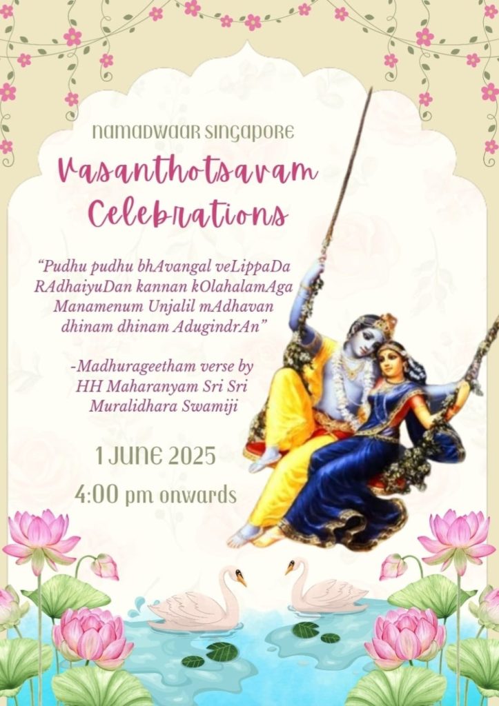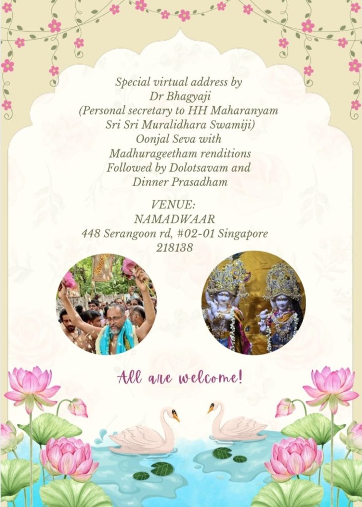 Radhe Radhe. Humble Namaskarams to Guruji Maharaj’s Lotus Feet on the Auspicious Guru Vaaram day (Thursday) . The posture of Lord Krishna and Sri Radha Rani, as captured in the Notice, declaring the Unfurl of Vasanthotsavam in the Sublime and Pristine Premises of Singapore Namadwaar, is captivating beyond reducing to words, holding us in Divine Captivity, of course! The Wonderful Agenda – Virtual Special Address by Dr Bhagyaji, Oonjal Seva accompanied by those Mesmerizing Madhurageethams of Guruji Maharaj, Dolotsavam, Dinner Prasadam – is woven so Thoughtfully and Enchantingly that it is going to be a Landmark Satsang, splashing the Landscape of Singapore Namadwaar and the environment thereon Exemplarily with Supreme Divinity, Auguring Immeasurable Prosperity, for Everybody! Gratification to Global, Glorious, Generous Guruji!!