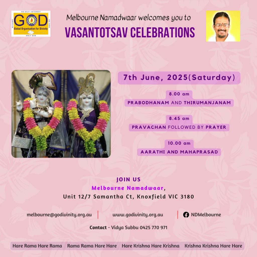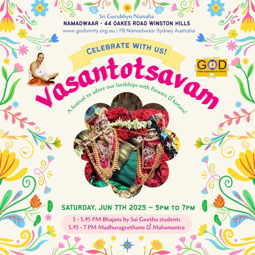 Radhe Radhe. Namaskarams submitted, with utmost humility, to Guruji Maharaj’s “Bliss-Embodied” Divine Feet! That “Bliss” is contagious and keeps us entranced, in His Protective clutches! “Vasanthotsavam Celebrations in Australia” is an “Enthralling Invite” that possesses the beautiful words “Celebrate with us” – spelling that mesmerizing feature of “Inclusivity” embedded in it. Even the Notices have that uncanny ability to infuse that adorable vibrancy – thanks to the Smiling Demeanour of our Fascinating Guruji, the coy and cute Presiding Deities – printed in it, so winsomely! The Enduring Appeal of Timeless Madhurageethams, Everlasting Allure of Mahamantra Chanting, Eternal Charisma of Bhajans by Sri Sai Geetha students – all these Adornments in the Festival draw the magnetism to the ‘genuine seekers’ minds’, courtesy our Magnanimous Guruji! Truckloads of Thankfulness to our Sri Sri G!