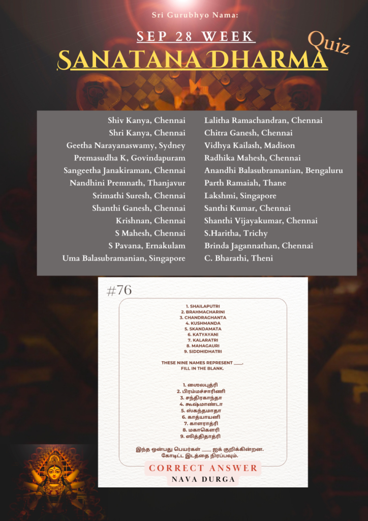 Home » Sanathana Dharma Quiz Sanathana Dharma Quiz Please enable JavaScript in your browser to complete this form.Week of October 5, 2025Name / பெயர் *Email / மின்னஞ்சல் *Phone (WhatsAapp Number) / தொலைபேசி எண் *Country / நாடு *AfghanistanAlbaniaAlgeriaAmerican SamoaAndorraAngolaAnguillaAntarcticaAntigua and BarbudaArgentinaArmeniaArubaAustraliaAustriaAzerbaijanBahamasBahrainBangladeshBarbadosBelarusBelgiumBelizeBeninBermudaBhutanBolivia (Plurinational State of)Bonaire, Saint Eustatius and SabaBosnia and HerzegovinaBotswanaBouvet IslandBrazilBritish Indian Ocean TerritoryBrunei DarussalamBulgariaBurkina FasoBurundiCabo VerdeCambodiaCameroonCanadaCayman IslandsCentral African RepublicChadChileChinaChristmas IslandCocos (Keeling) IslandsColombiaComorosCongoCongo (Democratic Republic of the)Cook IslandsCosta RicaCroatiaCubaCuraçaoCyprusCzech RepublicCôte d'IvoireDenmarkDjiboutiDominicaDominican RepublicEcuadorEgyptEl SalvadorEquatorial GuineaEritreaEstoniaEswatini (Kingdom of)EthiopiaFalkland Islands (Malvinas)Faroe IslandsFijiFinlandFranceFrench GuianaFrench PolynesiaFrench Southern TerritoriesGabonGambiaGeorgiaGermanyGhanaGibraltarGreeceGreenlandGrenadaGuadeloupeGuamGuatemalaGuernseyGuineaGuinea-BissauGuyanaHaitiHeard Island and McDonald IslandsHondurasHong KongHungaryIcelandIndonesiaIndiaIran (Islamic Republic of)IraqIreland (Republic of)Isle of ManIsraelItalyJamaicaJapanJerseyJordanKazakhstanKenyaKiribatiKorea (Democratic People's Republic of)Korea (Republic of)KosovoKuwaitKyrgyzstanLao People's Democratic RepublicLatviaLebanonLesothoLiberiaLibyaLiechtensteinLithuaniaLuxembourgMacaoMadagascarMalawiMalaysiaMaldivesMaliMaltaMarshall IslandsMartiniqueMauritaniaMauritiusMayotteMexicoMicronesia (Federated States of)Moldova (Republic of)MonacoMongoliaMontenegroMontserratMoroccoMozambiqueMyanmarNamibiaNauruNepalNetherlandsNew CaledoniaNew ZealandNicaraguaNigerNigeriaNiueNorfolk IslandNorth Macedonia (Republic of)Northern Mariana IslandsNorwayOmanPakistanPalauPalestine (State of)PanamaPapua New GuineaParaguayPeruPhilippinesPitcairnPolandPortugalPuerto RicoQatarRomaniaRussian FederationRwandaRéunionSaint BarthélemySaint Helena, Ascension and Tristan da CunhaSaint Kitts and NevisSaint LuciaSaint Martin (French part)Saint Pierre and MiquelonSaint Vincent and the GrenadinesSamoaSan MarinoSao Tome and PrincipeSaudi ArabiaSenegalSerbiaSeychellesSierra LeoneSingaporeSint Maarten (Dutch part)SlovakiaSloveniaSolomon IslandsSomaliaSouth AfricaSouth Georgia and the South Sandwich IslandsSouth SudanSpainSri LankaSudanSurinameSvalbard and Jan MayenSwedenSwitzerlandSyrian Arab RepublicTaiwan, Province of ChinaTajikistanTanzania (United Republic of)ThailandTimor-LesteTogoTokelauTongaTrinidad and TobagoTunisiaTurkeyTurkmenistanTurks and Caicos IslandsTuvaluUgandaUkraineUnited Arab EmiratesUnited Kingdom of Great Britain and Northern IrelandUnited States Minor Outlying IslandsUnited States of AmericaUruguayUzbekistanVanuatuVatican City StateVenezuela (Bolivarian Republic of)VietnamVirgin Islands (British)Virgin Islands (U.S.)Wallis and FutunaWestern SaharaYemenZambiaZimbabweÅland IslandsState / மாநிலம் *City / நகரம் / மாவட்டம் *Question of the week / வாரத்தின் கேள்விAnswer / பதில் *Kindly submit relevant responses in all fields. Questions will be posted every Monday. Responses will be accepted until the subsequent Friday upto 10pm IST. கேள்வி ஒவ்வொரு திங்கட்கிழமை காலையில் வெளியாகும். அதைத் தொடர்ந்து வரும் வெள்ளிக்கிழமை இரவு 10 மணிக்குள் விடைகளை அளிக்கலாம். விடை அளிக்கும்பொழுது அங்கு கேட்கபட்டிருக்கும் உங்கள் விபரங்களை சரியாக பகிரவும்.Submit Recent Quiz Results Sep 28, 2025 – Correct Answer Sep 21, 2025 – Correct Answer Sep 14, 2025 – Correct Answer Sep 7, 2025 – Correct Answer Aug 31, 2025 – Correct Answer Aug 24, 2025 – Correct Answer Aug 17, 2025 – Correct Answer Aug 10, 2025 – Correct Answer Aug 3, 2025 – Correct Answer July 27, 2025 – Correct Answer
