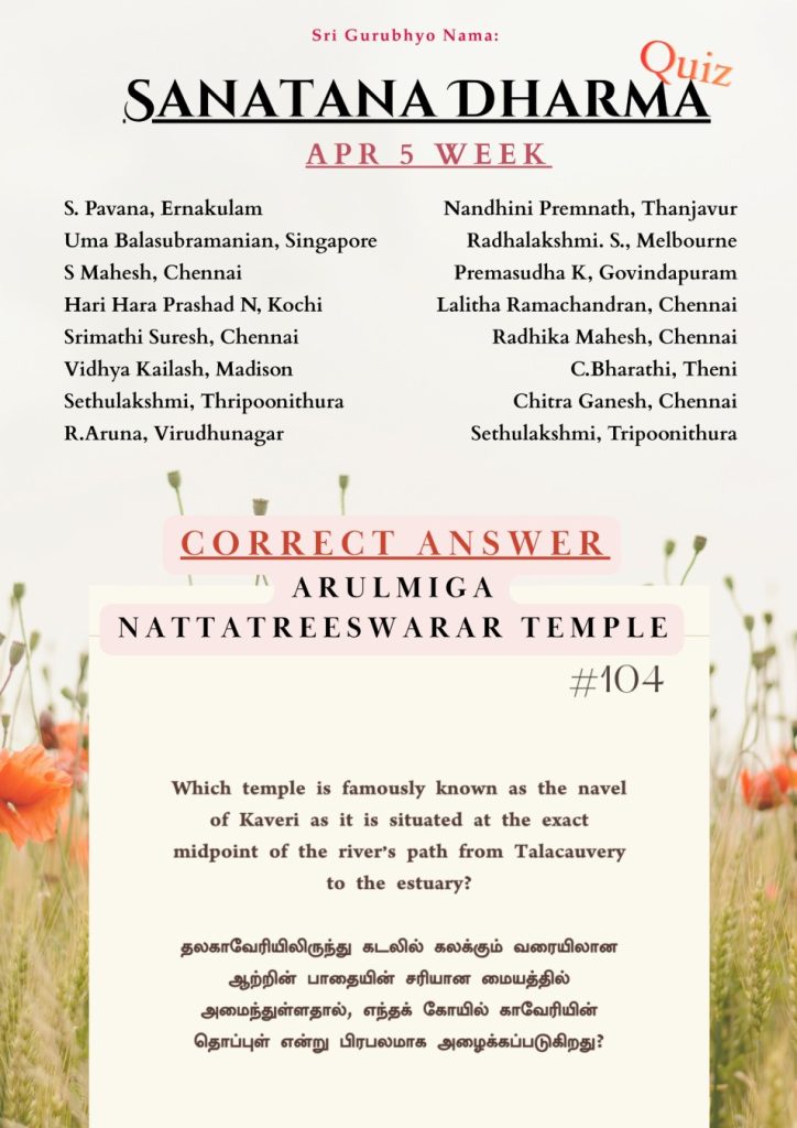 Home » Sanathana Dharma Quiz » April 6, 2026 – Correct Answer April 6, 2026 – Correct Answer Recent Quiz Results April 12, 2026 – Correct Answer April 6, 2026 – Correct Answer April 1, 2026 – Correct Answer March 22, 2026 – Correct Answer March 15, 2026 – Correct Answer March 8, 2026 – Correct Answer March 1, 2026 – Correct Answer Feb 22, 2026 – Correct Answer Feb 15, 2026 – Correct Answer Feb 8, 2026 – Correct Answer