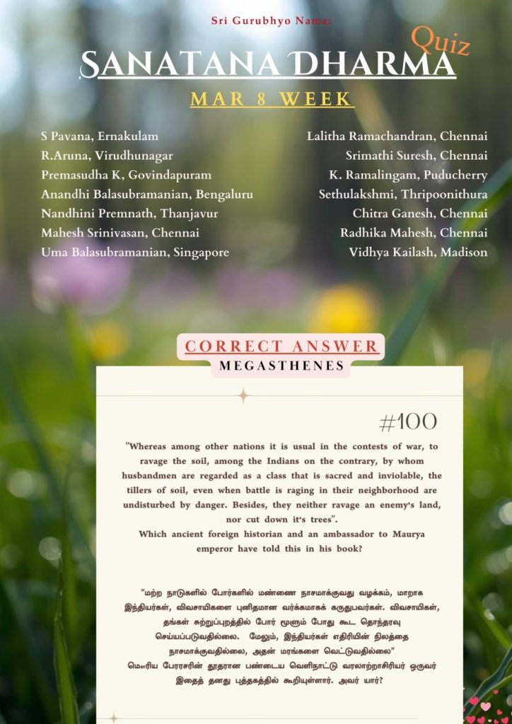 Home » Sanathana Dharma Quiz » March 8, 2026 – Correct Answer March 8, 2026 – Correct Answer Recent Quiz Results March 8, 2026 – Correct Answer March 1, 2026 – Correct Answer Feb 22, 2026 – Correct Answer Feb 15, 2026 – Correct Answer Feb 8, 2026 – Correct Answer Feb 1, 2026 – Correct Answer Jan 25, 2026 – Correct Answer Jan 4, 2026 – Correct Answer Dec 28, 2025 – Correct Answer Dec 21, 2025 – Correct Answer