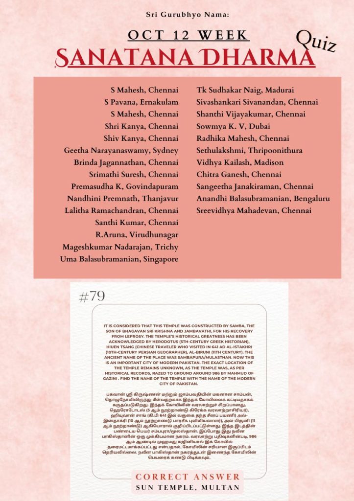Home » Sanathana Dharma Quiz » Oct 12, 2025 – Correct Answer Oct 12, 2025 – Correct Answer Recent Quiz Results Oct 19, 2025 – Correct Answer Oct 12, 2025 – Correct Answer Oct 5, 2025 – Correct Answer Sep 28, 2025 – Correct Answer Sep 21, 2025 – Correct Answer Sep 14, 2025 – Correct Answer Sep 7, 2025 – Correct Answer Aug 31, 2025 – Correct Answer Aug 24, 2025 – Correct Answer Aug 17, 2025 – Correct Answer
